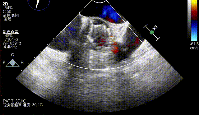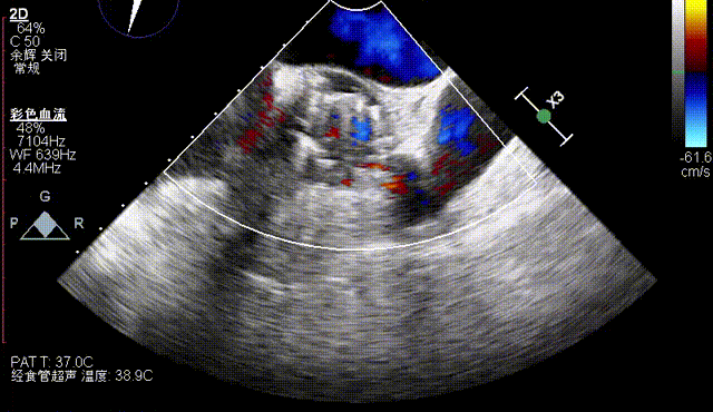 术后即刻TEE示主动脉瓣膜最大峰值血流速为2.4m/s,平均跨瓣压差为11mmHg,支架内未见明显反流或瓣周漏。