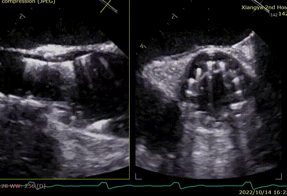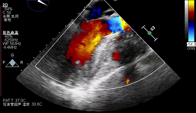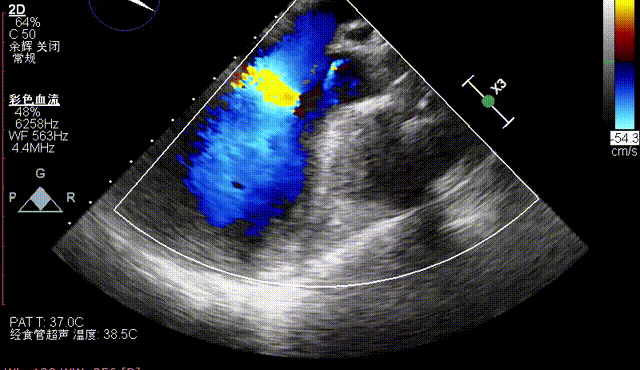 术后即刻TEE示主动面瓣膜最大峰值血流速为1.1m/s,平均跨瓣压差为2mmHg,少量瓣周漏。