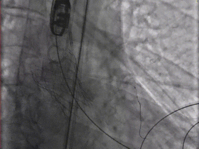 F. 最终造影显示瓣膜位置良好冠脉开口血流正常,撤出冠脉保护