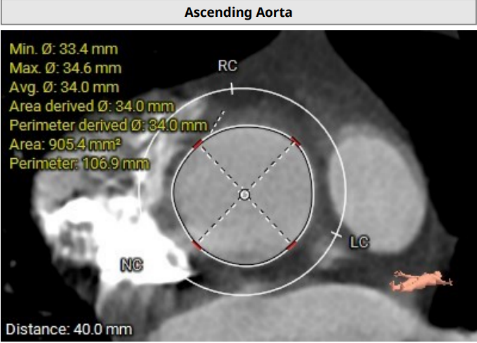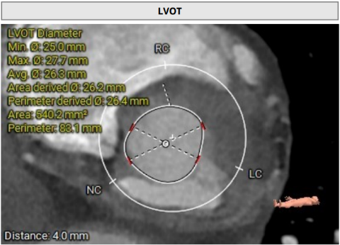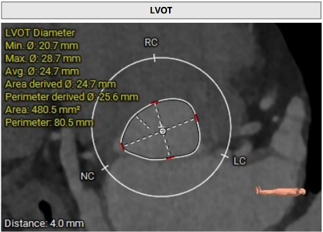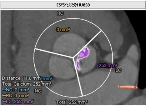 患者左冠脉开口高度11.0mm,左冠窦瓣叶长度14.3mm, 瓣叶明显增厚,有轻度钙化。应注意术中有冠脉闭塞风险。患者未见明显心室隔膜部,新发的房室传导阻滞风险较高。