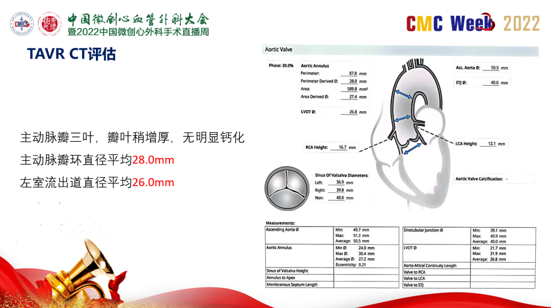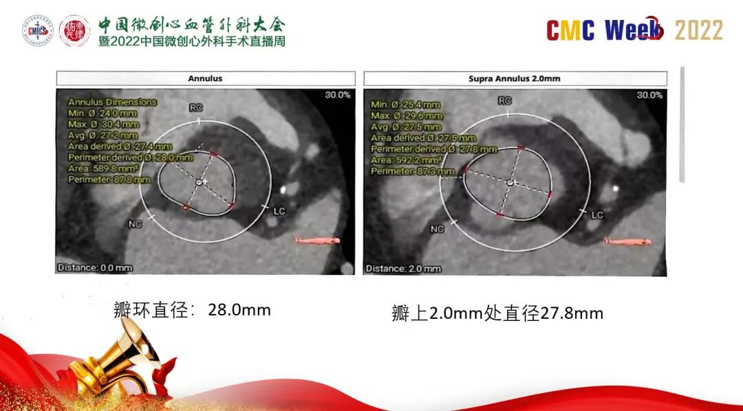 患者为76岁男性,既往有“高血压、脑梗死”病史,心脏彩超提示:主动脉瓣重度关闭不全,升主动脉瘤样扩大,左心扩大,EF64%,NT-proBNP 2600.ECG:窦缓(58次/分),偶发室早;TAVR CT评估,患者主动脉瓣三叶式,瓣叶稍增厚,无明显钙化,主动脉瓣环直径平均28.00mm,选择29mm瓣膜,它独有的定位键能够精准定位主动脉瓣瓣环位置,并提供额外的纵向支撑力,避免瓣膜移位并无需过度Oversize,从而降低传导阻滞的风险,并且短支架,冠脉风险小。