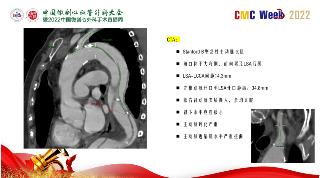 今天第三场是来自吉林大学第一医院高永生教授带来的分支型主动脉覆膜支架的应用。患者为54岁男性,10天前因“突发剧烈胸背部疼痛6小时余”,外院心超提示主动脉夹层。入吉林大学第一医院行胸腹主动脉CTA检查诊断为主动脉夹层(Stanford B型)。有长期高血压病史,控制欠佳,最高血压204/130mmHg。长期吸烟、饮酒史。病程中无发热、头晕、意识不清,无咯血、呕吐,无腹泻、血便,无肢体活动不灵,无腹胀、腹痛。
