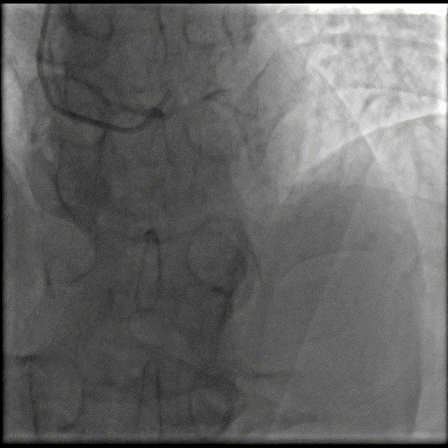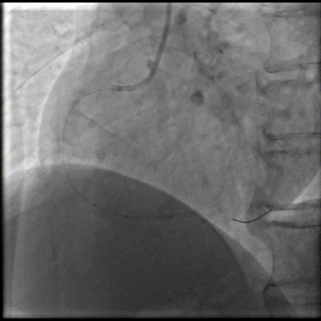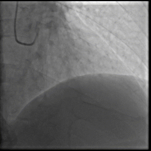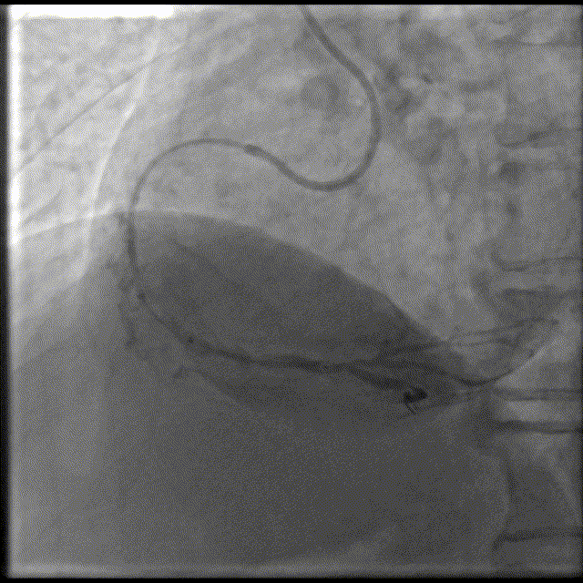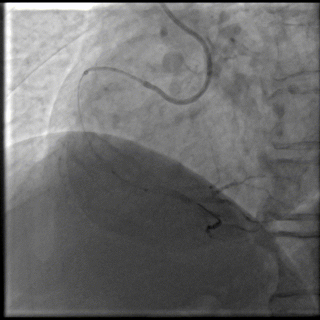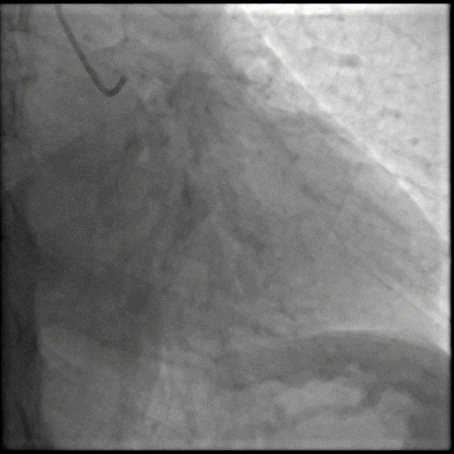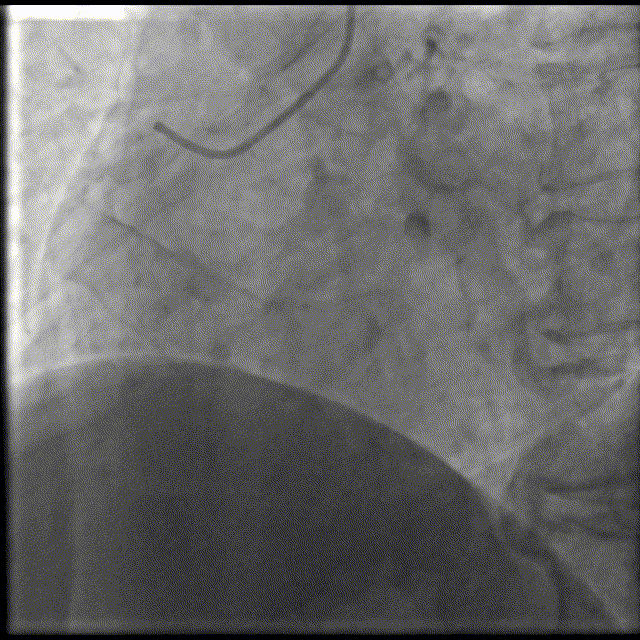 头位造影:RCA近中段钙化迂曲,第二转折处中度狭窄。