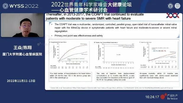 11月12日第二日下半场二尖瓣MC专场,中国医学科学院阜外医院潘湘斌教授向我们介绍了MitraClip在全球及中国的应用现状。浙江大学医学院附属第二医院刘先宝教授向我们分享了FMR的TEER治疗思考。厦门大学附属心血管病医院王焱教授为我们带来了TEER最新研究与未来发展及经验分享。来自台北荣民总医院的宋思贤教授为我们讲解了MitraClip并发症及术中特殊情况的应对策略。