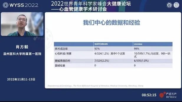 在左心耳封堵专场,首先由温州医科大学附属第一医院黄伟剑教授、周浩教授开场致辞,随后,温州医科大学附属第一医院肖方毅教授为我们带来了左心耳封堵器塞式vs盘式,优劣及选择的专题演讲,海军军医大学附属长海医院秦永文教授为我们带来了LACbes的植入注意事项及单中心经验分享,澳门镜湖医院谭冠昶教授为我们带来了WATCHMAN FLX复杂病例分享;同时温医大附一院黄伟剑教授、周浩教授、肖方毅副主任以及澳门镜湖医院谭冠昶教授、来自海军军医大学附属长海医院的白元教授为我们带来了精彩的左心耳封堵手术演示。线上多名专家都参与了热烈的讨论。