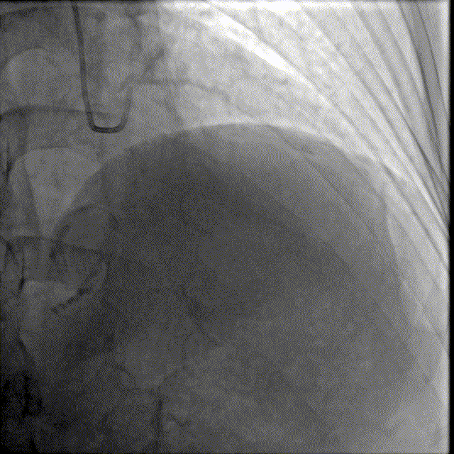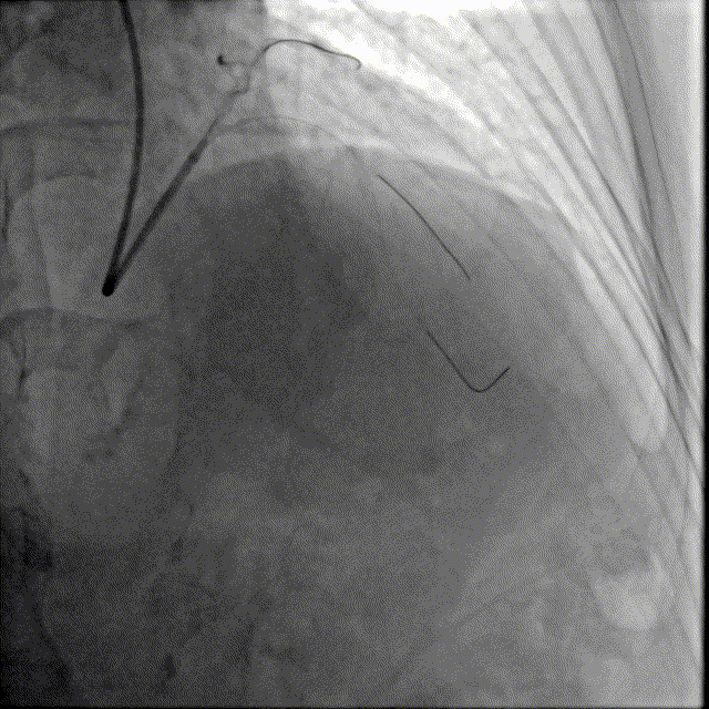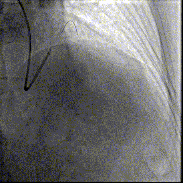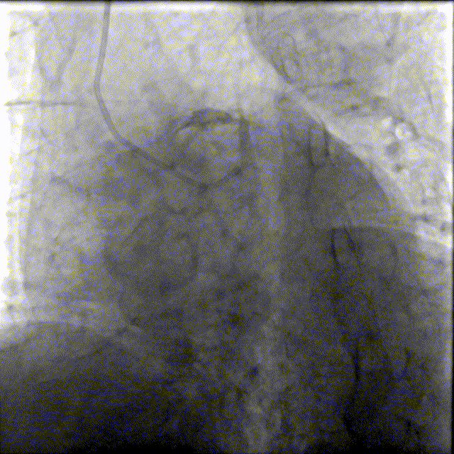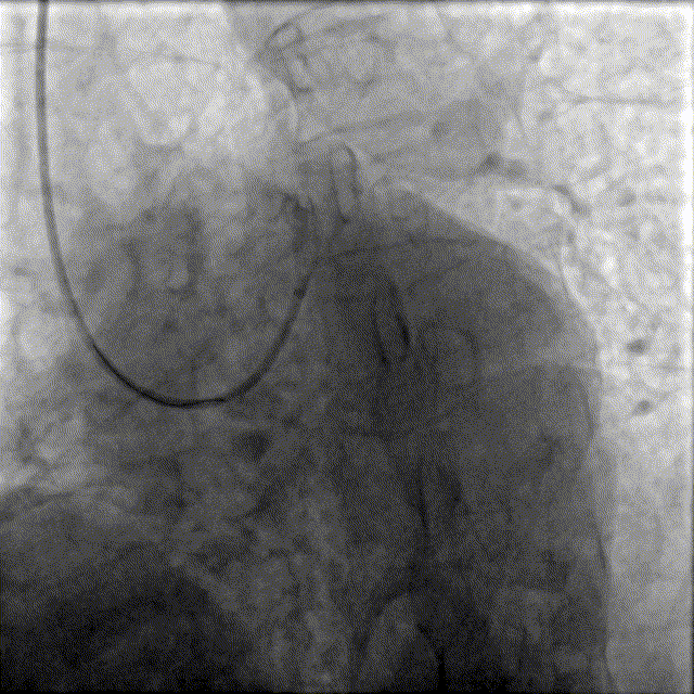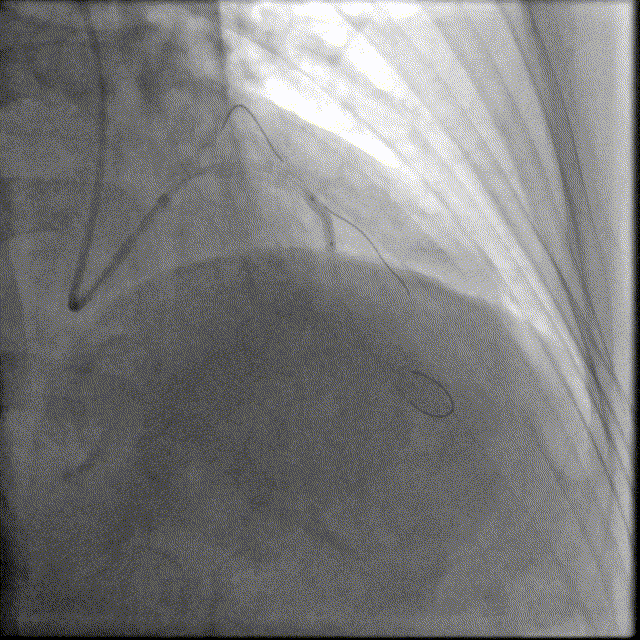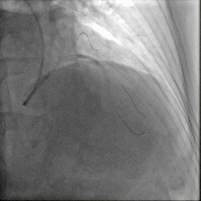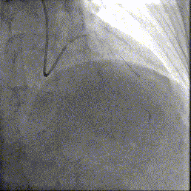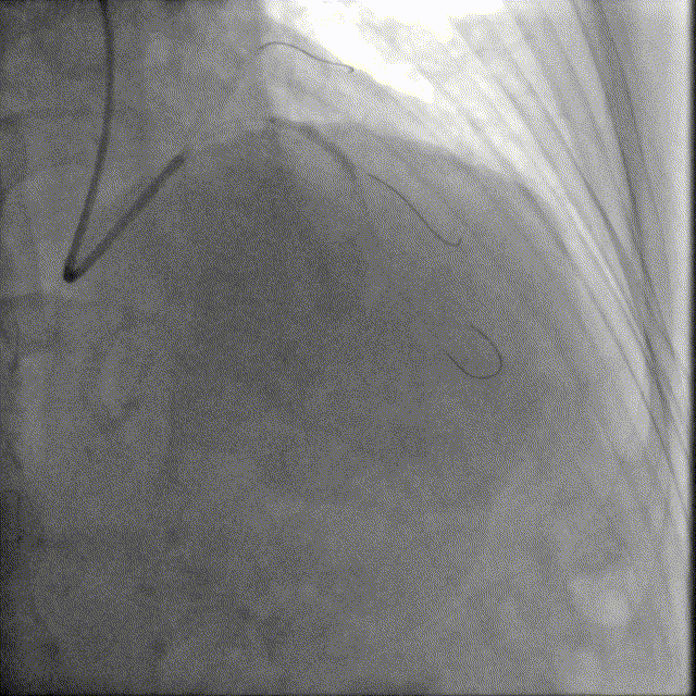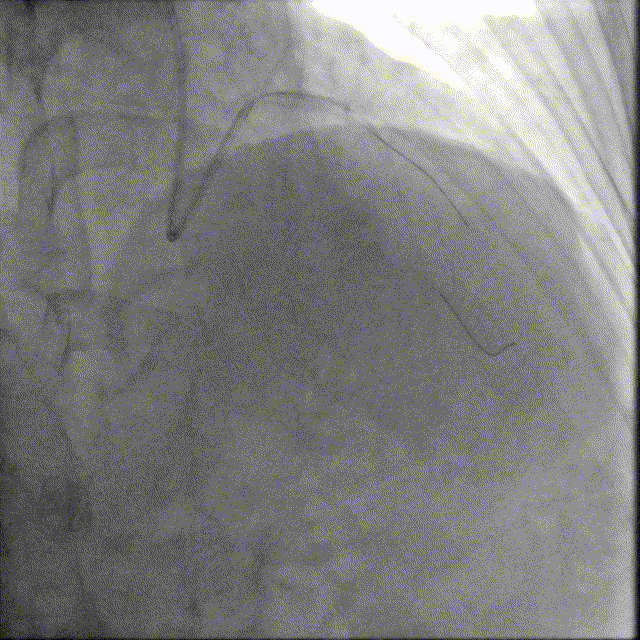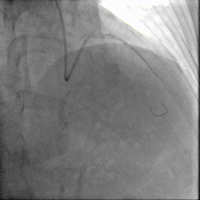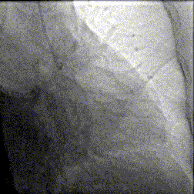 冲击波导管送至左前降支,由中段至开口依次以4atm压力初始冲击扩张,6atm压力巩固扩张,共冲击扩张10秒×8个周期,可见球囊逐渐膨胀充分。此阶段在处理前降支开口时预置回旋支保护导丝。