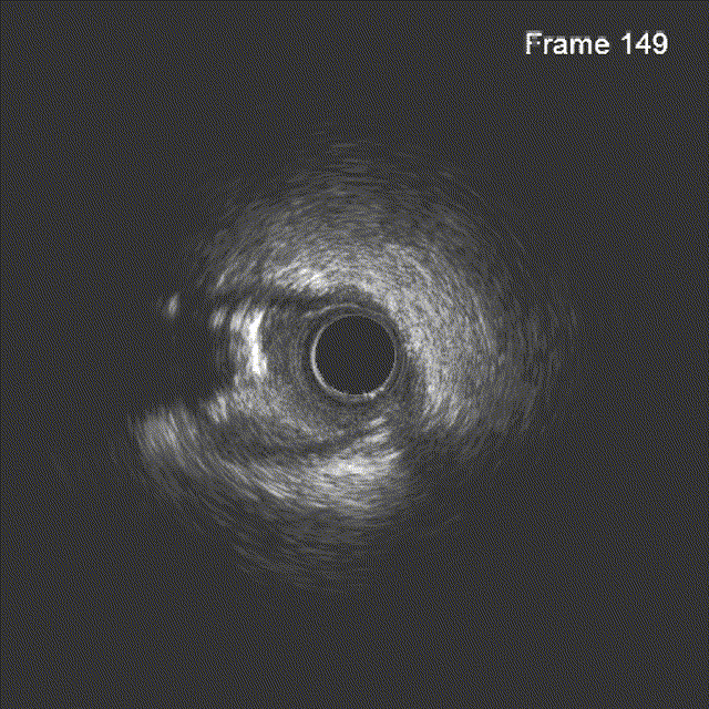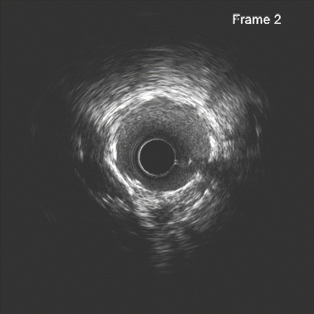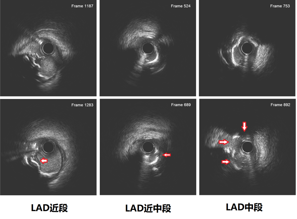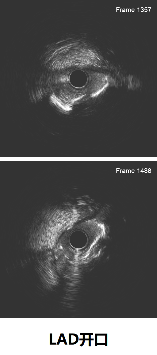 复查IVUS提示前降支原近中段钙化斑块、钙化小节碎裂,未见明显夹层。