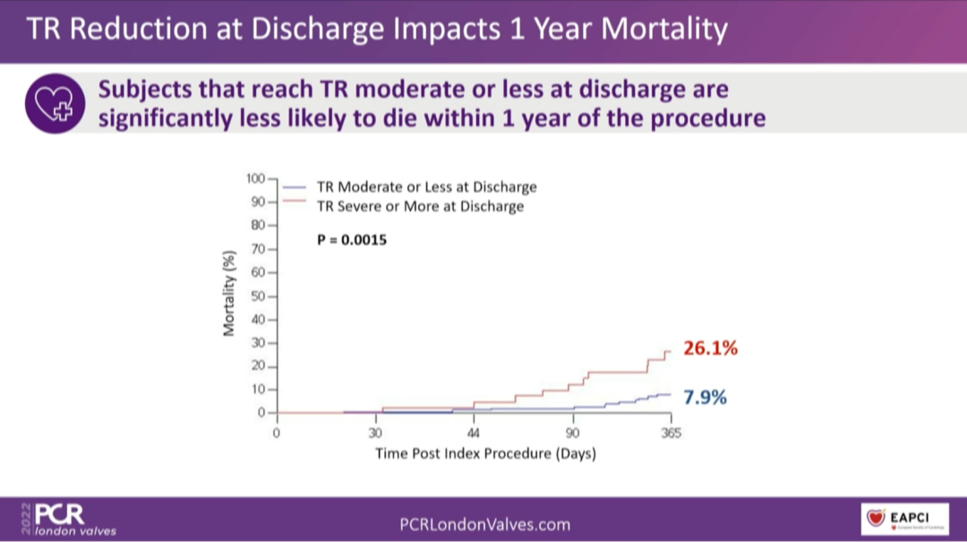 按照出院时TR降低程度分组进行亚组分析,结果显示,出院时TR等级在重度及以上的患者,1年时死亡率为26.1%,出院时TR等级在中度及以下的患者,1年时死亡率为7.9%,差异具有统计学意义(P=0.0015),结果表明,通过器械治疗将患者TR等级降低至中度及以下能够降低患者1年内死亡的风险(见图8)。