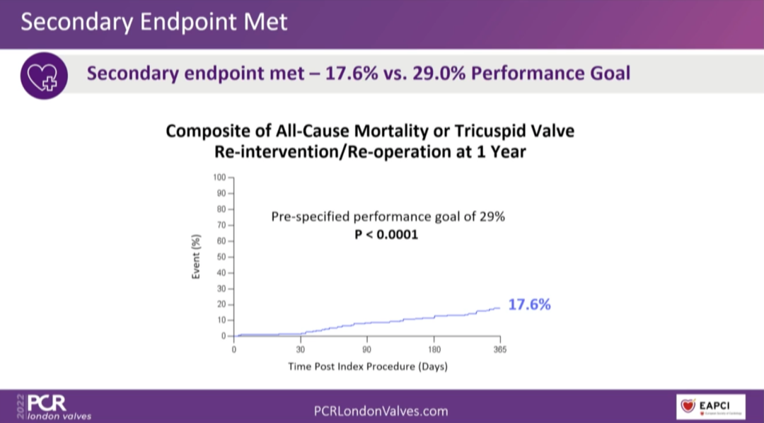 术后1年全因死亡率或三尖瓣再介入治疗/再手术率为17.6%,远低于预设的目标值(29%,P <0.0001)(见图4)。