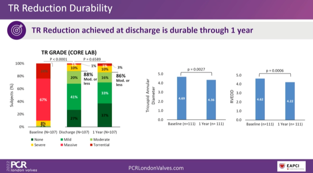 通过将患者超声结果进行配对分析(基线,出院时和1年随访均具有相应数据),结果发现,出院时,88%例患者TR等级降至中度及以下,与基线时相比,差异具有明显的统计学意义(P<0.0001)。1年时,TR等级在中度及以下的比例仍维持在86%的水平,与出院时无明显差异(P=0.6578)。此外,与基线时相比,1年随访时患者的三尖瓣瓣环直径(P = 0.0027)和右室舒张末期直径(RVEDD)(P = 0.0006)均得到了一定程度的改善(见图5)。