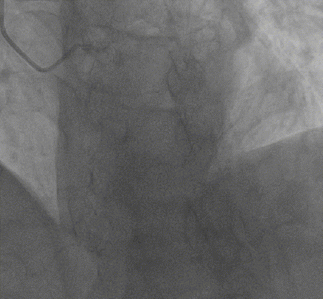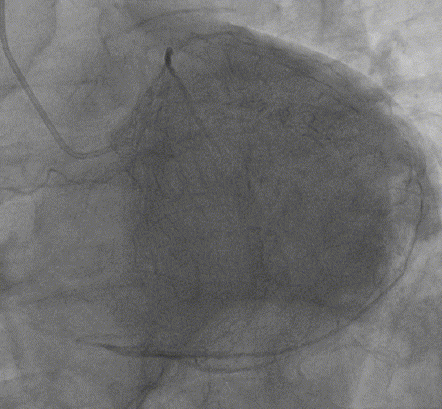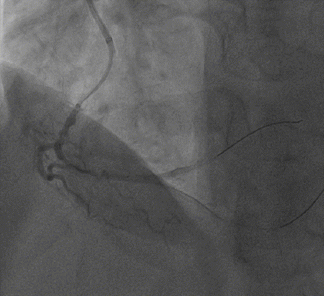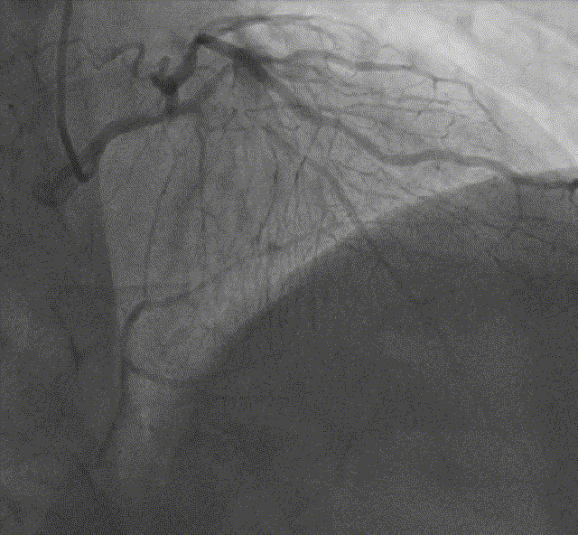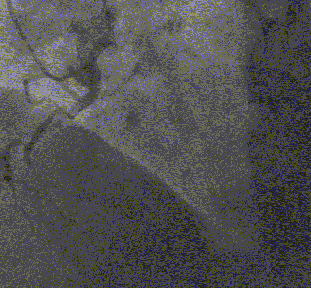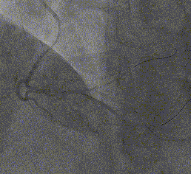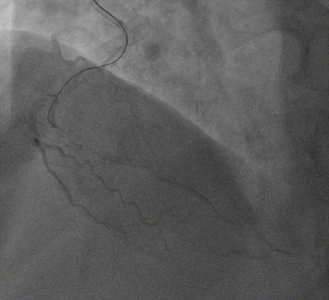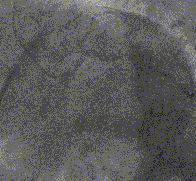 LM远端局限狭窄约50%;LAD自D1后慢性完全闭塞,可见桥侧支;LCX中段长短、段不规则狭窄最重约90%;可见左冠向右冠侧支循环
