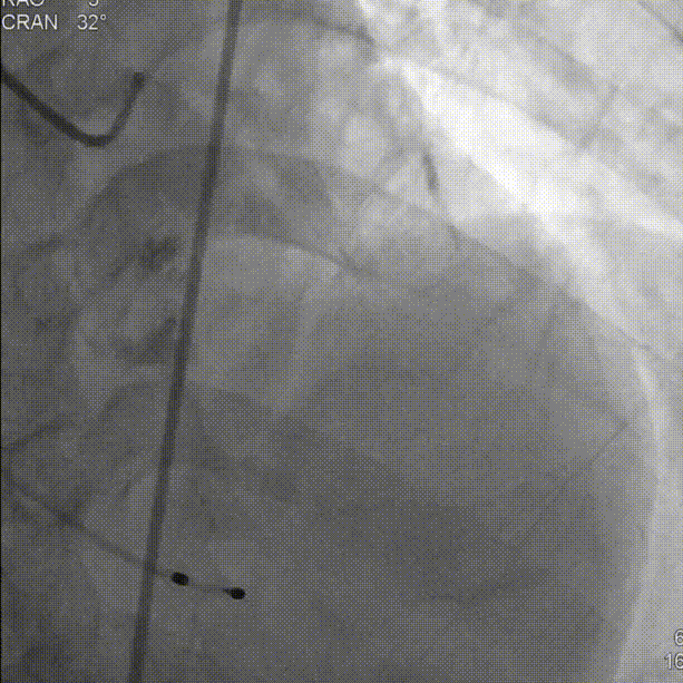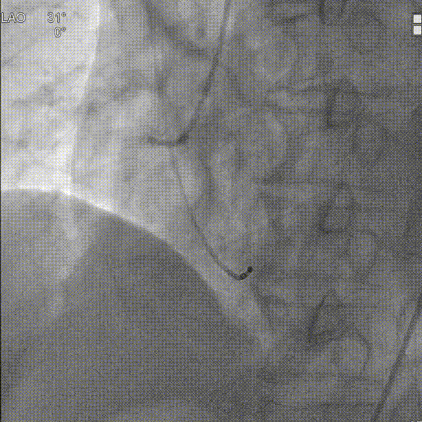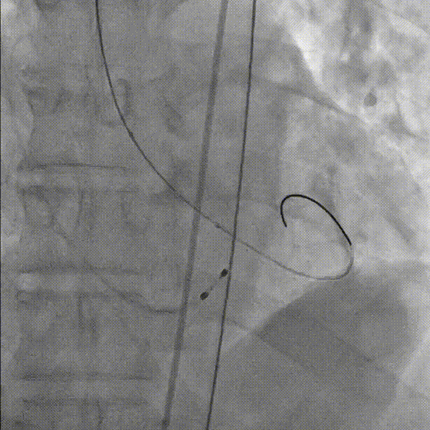 于右室放置起搏导线。超声引导下穿刺外周动脉,左右冠脉造影未见明显狭窄: