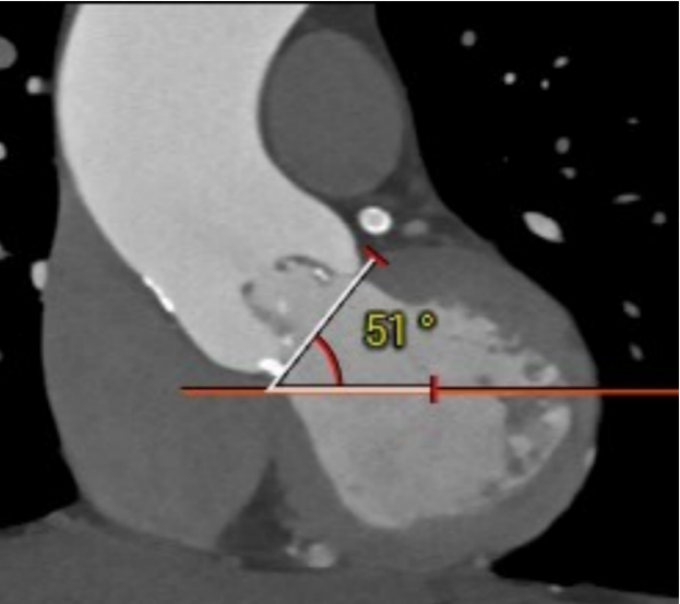 Evolut PRO在此类结构中具有明显优势,短瓣架、胶囊整体可打弯的属性使得其在此类入路中轻松应对,同时瓣架软硬适中,结合高吊设计,可以更好地解决二叶瓣所带来的问题,自适应二叶瓣鱼嘴状开口,有效锚定和避免瓣周漏的同时,保障有效的环上开口,极大提升了二叶瓣患者的血流动力学及远期预后。