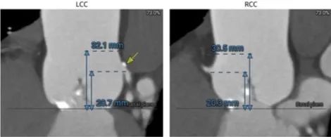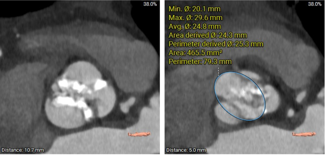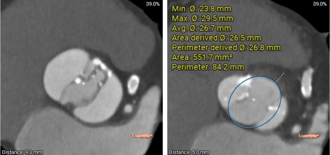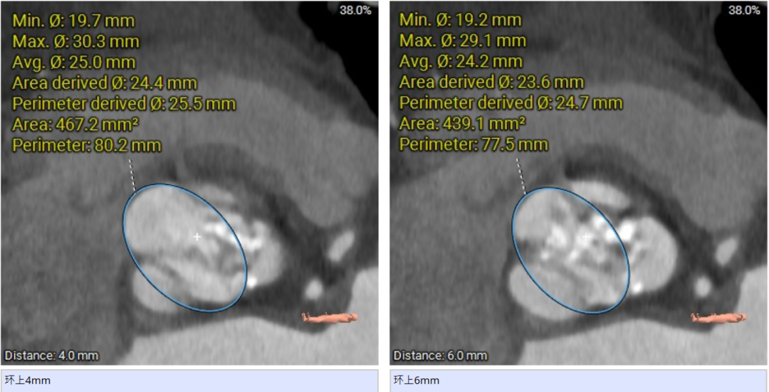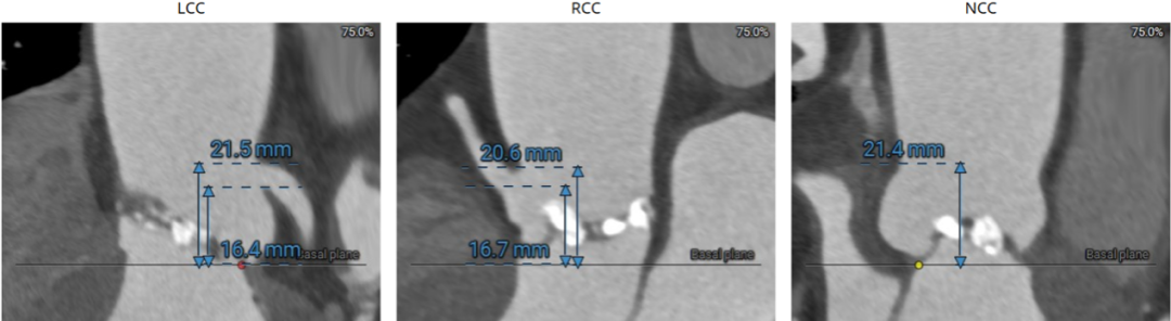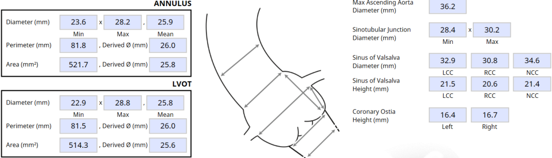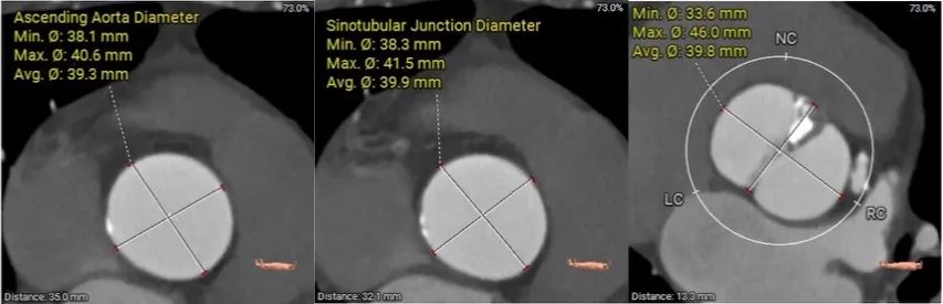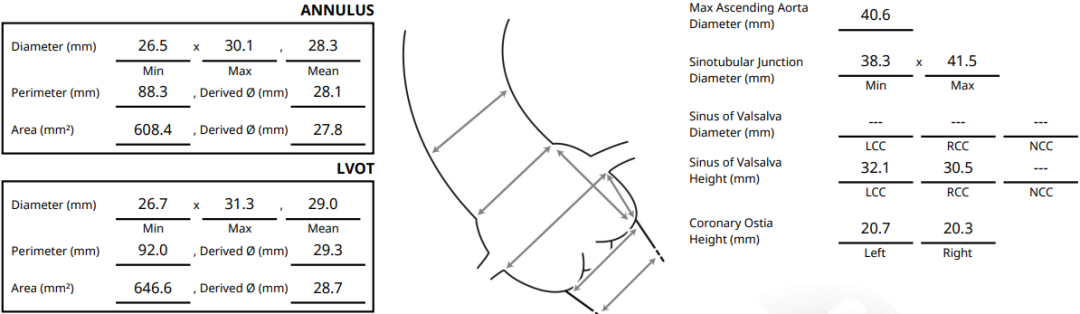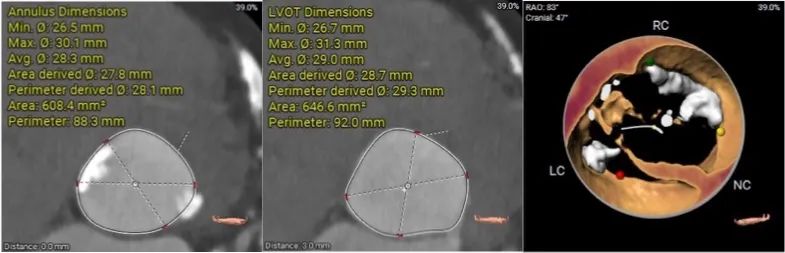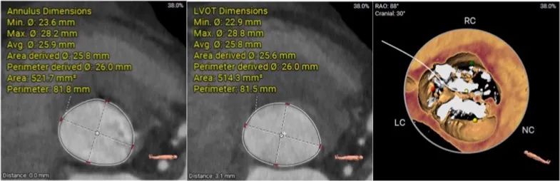 患者Type1型二叶瓣,左右窦之间存在融合嵴,瓣叶增厚增长且钙化重,可以为瓣膜提供很好的锚定,但同时又有瓣膜展开受限的挑战,会导致瓣周漏的发生,因此权衡瓣膜尺寸以及瓣周漏成为此例手术的重点和难点。
