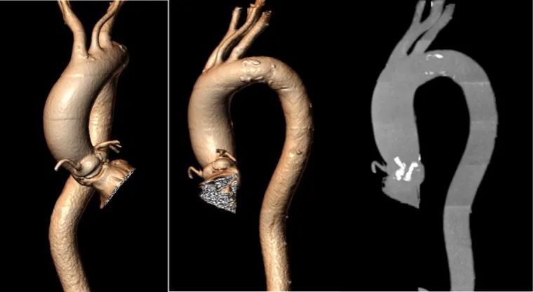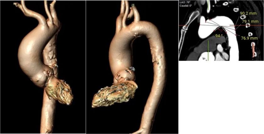 Type0型二叶瓣自身具有定位困难的挑战,植入策略的观点也各有不同,对瓣膜性能要求更高,既需要在二叶瓣特殊结构挤压下牢固锚定,又要贴合鱼嘴状结构最大限度避免瓣周漏的发生。同时此患者合并存在主动脉弓距小,弓角锐角的特点,对瓣膜系统的整体通过性能提出挑战。