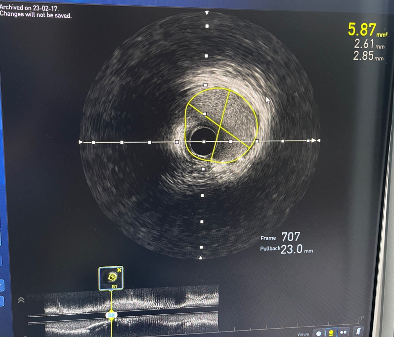 徐亚伟教授应用ETcath 200介入机器人对指引导管进行精准调整,使其到达冠状动脉口部,建立器械输送通路,并使用机器人的多种模式操作导丝,避免导丝进入分支,顺利将指引导丝推送至病变远端,应用机器人循导丝推送IVUS进行评估,测得管腔面积仅剩余2.31mm²。