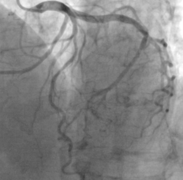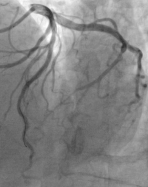 该患者因右侧桡动脉搏动较弱,本次手术穿刺左侧桡动脉,术中造影提示前降支血管重度狭窄,严重影响心肌供血,这是导致该患者频繁胸痛的罪魁祸首。经充分评估,徐亚伟教授决定应用ETcath 200介入手术机器人通过隔室操作为其进行冠状动脉介入治疗。