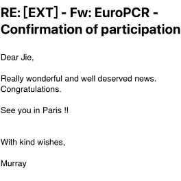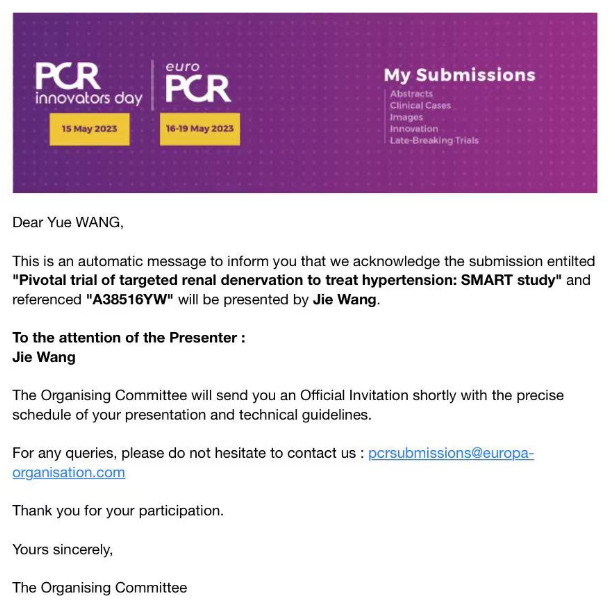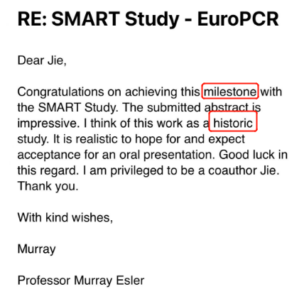 也正因如此,SMART试验也同样受到了海外权威专家们的认可与关注。在确认收到EuroPCR2023官方邀请邮件后,世界著名心脏病专家和肾动脉消融领域中世界著名权威Murray Esler教授、Paul A. Sobotka教授几乎第一时间发来祝贺,并分别以“里程碑”、“历史意义”、“突破”等词语描述了对试验数据在会上发布后可能带来重大影响的预期。