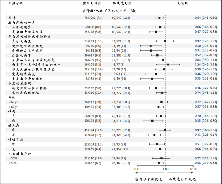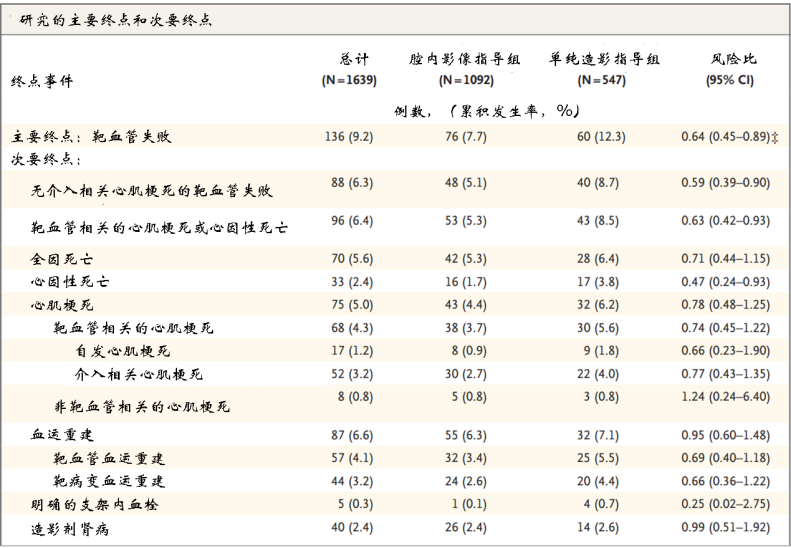 单纯造影指导组有60例发生主要终点事件(累积发生率12.3%),腔内影像指导组有76例发生主要终点事件(累积发生率7.7%),两组之间存在显著差异(风险比0.64; 95%置信区间0.45-0.89; P = 0.008)。其中,单纯造影指导组有17例心因性死亡(累积发生率3.8%),30例靶血管相关心肌梗死(累积发生率5.6%),25例临床驱动血运重建(累积发生率5.5%);腔内影像指导组有16例心因性死亡(累积发生率1.7%),38例靶血管相关心肌梗死(累积发生率3.7%),32例临床驱动血运重建(累积发生率3.4%)。