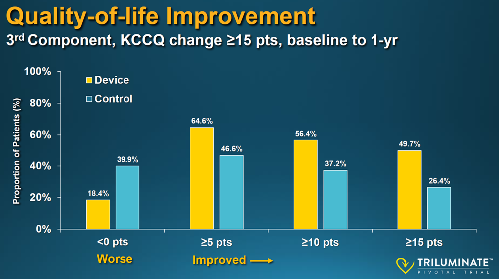 三尖瓣反流的减少能改善TEER术后患者的生活质量。1年随访时TEER组KCCQ评分平均增加约12分,而对照组仅增加1分左右。 TEER组KCCQ评分提高大于15分的患者人数几乎是对照组的两倍。这项结果远远超出预期。