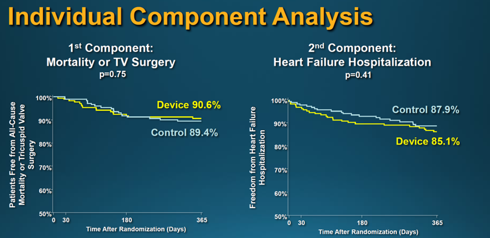 这项前瞻性、随机、对照试验说明TEER技术治疗重度三尖瓣反流是安全的;在大多数接受该手术的患者中,三尖瓣反流的严重程度在1年随访时降至中度以下。本项研究结果似乎优于之前的非随机注册研究。这种差异可能与介入及超声医生的经验、术中图像的优化和器械设计相关。TEER术后残余三尖瓣反流在1年随访时比较稳定,未有明显增加。