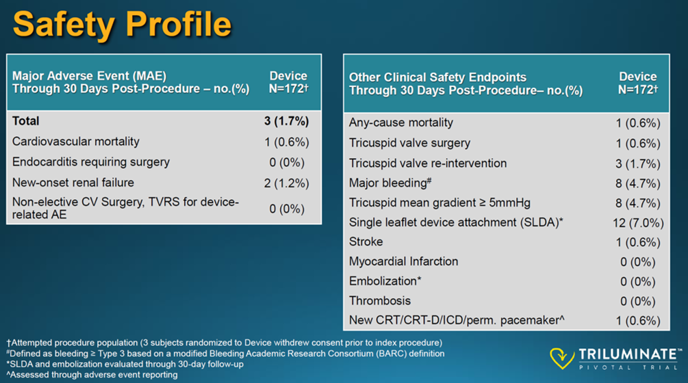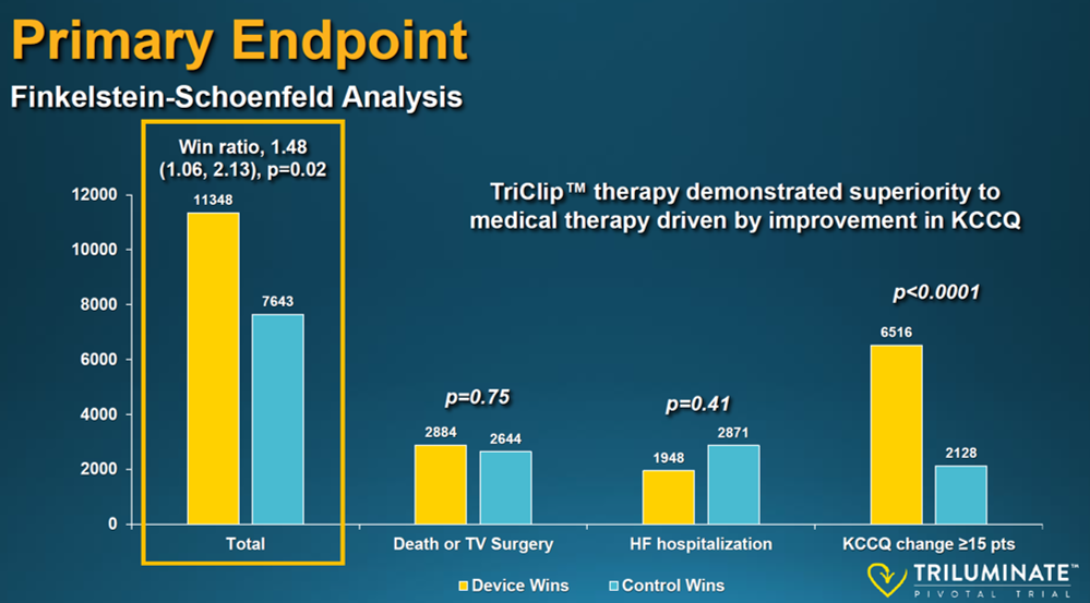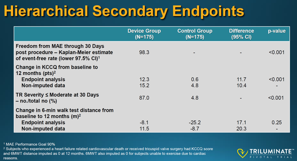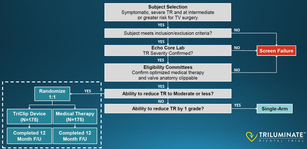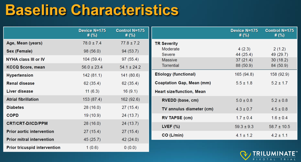TRILUMINATE Pivotal研究是一项前瞻性随机对照试验,目的是评价经皮缘对缘修复系统TriClipTM在治疗三尖瓣反流患者中的有效性和安全性。共纳入美国、加拿大和欧洲的80余家中心,以1:1随机入组的方式,将患者分为试验组(经皮缘对缘修复TEER组)或对照组(药物治疗组)(图1)。主要纳入标准为 1)有症状的重度三尖瓣反流;2)药物和/或器械治疗心衰稳定30天以上;3)外科手术中高危。主要排除标准为 1)其他瓣膜需要介入治疗;2)严重肺动脉高压;3)左心射血分数小于20%;4)解剖结构不适合TriClipTM系统。主要复合终点包括全因死亡或行三尖瓣外科手术;因心力衰竭住院;堪萨斯城心肌病问卷 (KCCQ) 测量显示患者生活质量改善,其改善定义为1年随访时KCCQ评分(范围为0至100,评分越高表示生活质量越好)至少增加15分。次要终点包括:1)30天内没有发生主要不良事件(包括心血管原因死亡、新发肾功能衰竭、接受手术治疗的心内膜炎、与TriClipTM操作系统相关不良事件而需行非择期心血管手术)(仅试验组);2)试验组和对照组在1年随访时KCCQ评分变化;3)试验组和对照组在30天随访时三尖瓣反流严重程度的降低程度及KCCQ评分变化;4)试验组和对照组1年随访时的6分钟步行距离。
