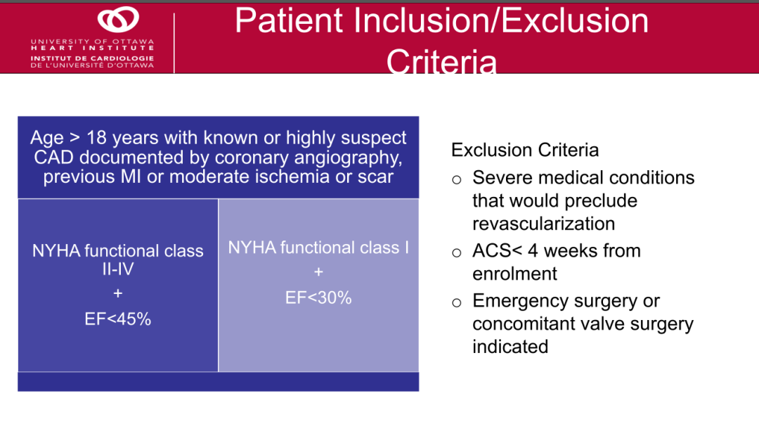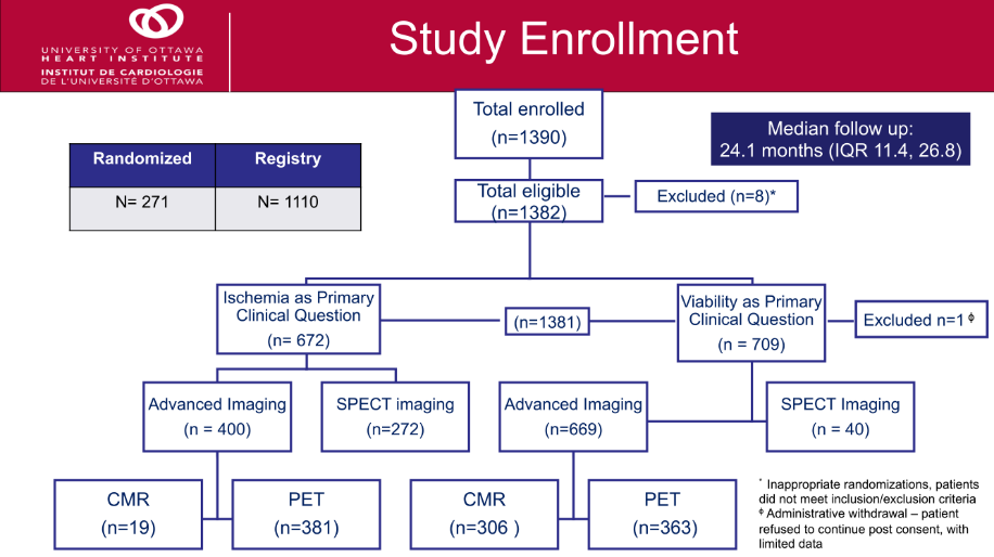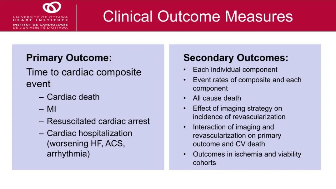 该研究最终纳入1381例IHF患者。纳入标准为:1. 年龄> 18岁,通过冠状动脉造影、心梗病史、影像学发现中度缺血或瘢痕等方式确诊或高度怀疑冠心病。2.射血分数(EF)≤45%,NYHA心功能分级II-IV级或EF≤30%。排除标准为:1. 缺乏进行血运重建的医疗条件。2. 自入组4周内发生ACS。3. 需要急诊手术或伴有瓣膜手术指征。该研究旨在比较IHF患者成像策略对心源性死亡、心肌梗死(MI)、心脏骤停复苏和心脏再住院(恶化的心力衰竭、急性冠状动脉综合征、心律失常)复合临床终点的影响。