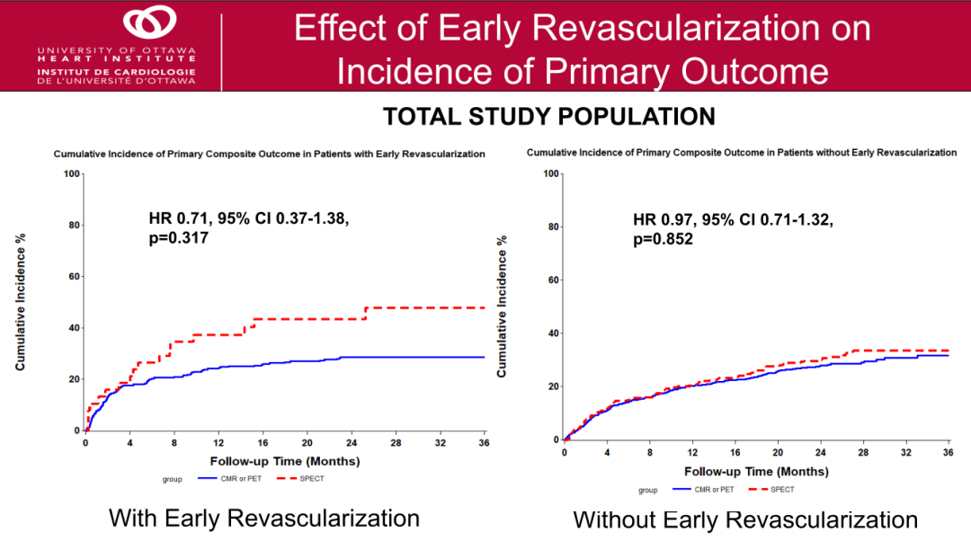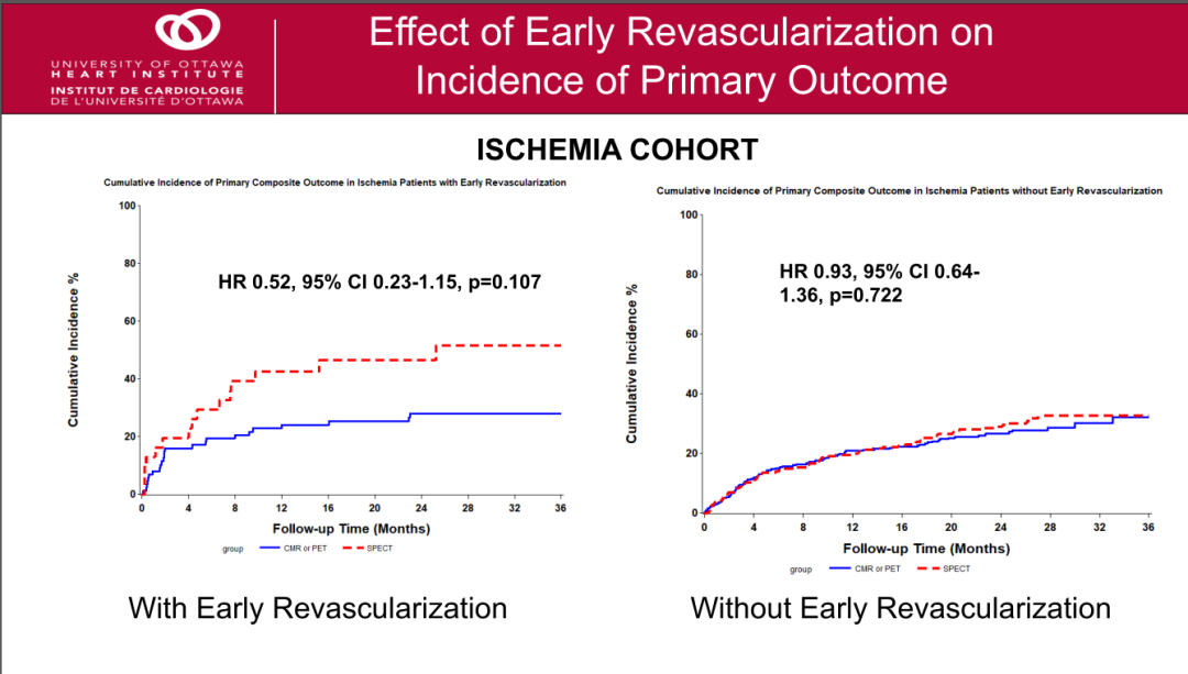 此外,研究者还发现,接受高级影像学检查的患者进行血运重建的比例更高(p<0.0001)。分析总体人群数据发现:对于早期进行血运重建的患者,与SPECT组相比,ADV组患者的主要终点的累积发病率降低(HR 0.71,95%CI 0.37-1.38;P=0.317),在672例缺血队列患者中观察到同样的结果(HR 0.52, 95% CI 0.23-1.15, p=0.107)。