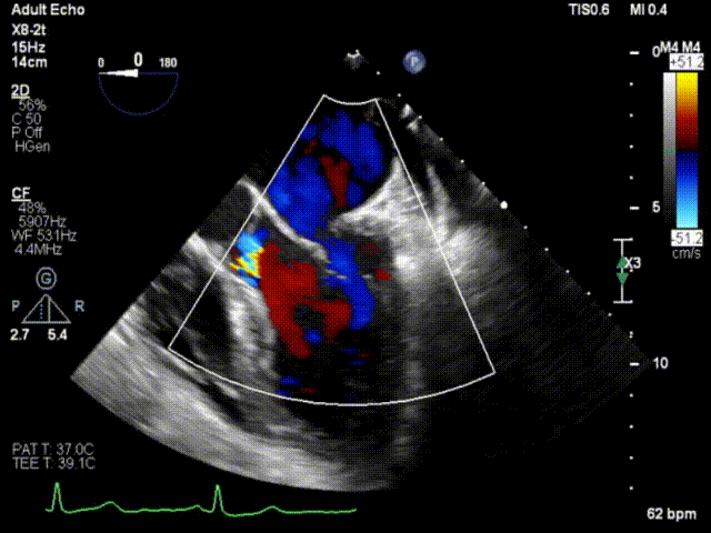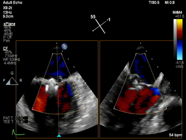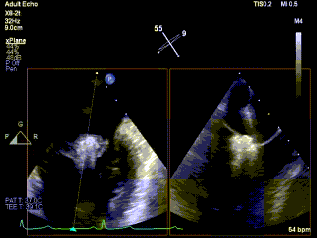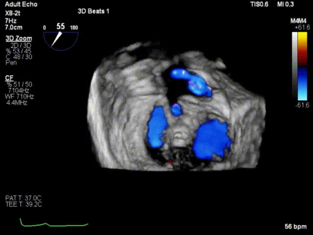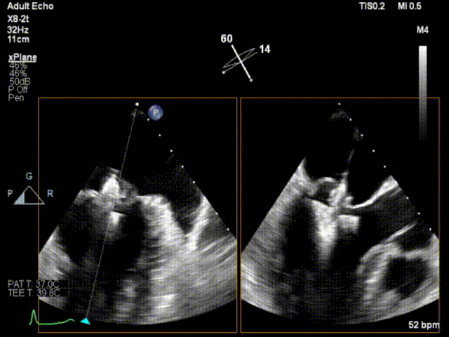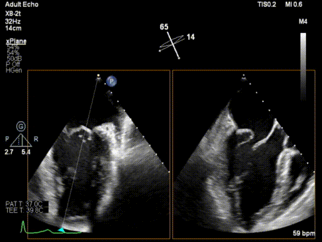 手术运用DSA与三维经食道超声心动图监测,通过患者股静脉穿刺房间隔途径建立夹合器输送轨道,将夹合器送进左心房,借助夹合器输送系统通过病变的二尖瓣部位,在心脏不停跳的状态下快速完成二尖瓣脱垂瓣叶的破获和夹合,夹合位置满意,超声提示反流降至1+,遂释放夹合器,反流最终程度为1+,结束手术,手术过程耗时一小时左右。