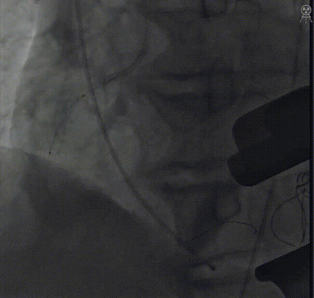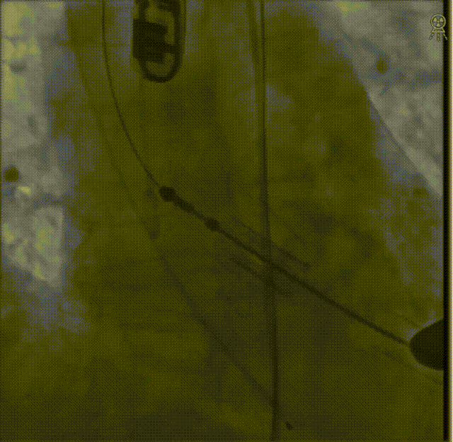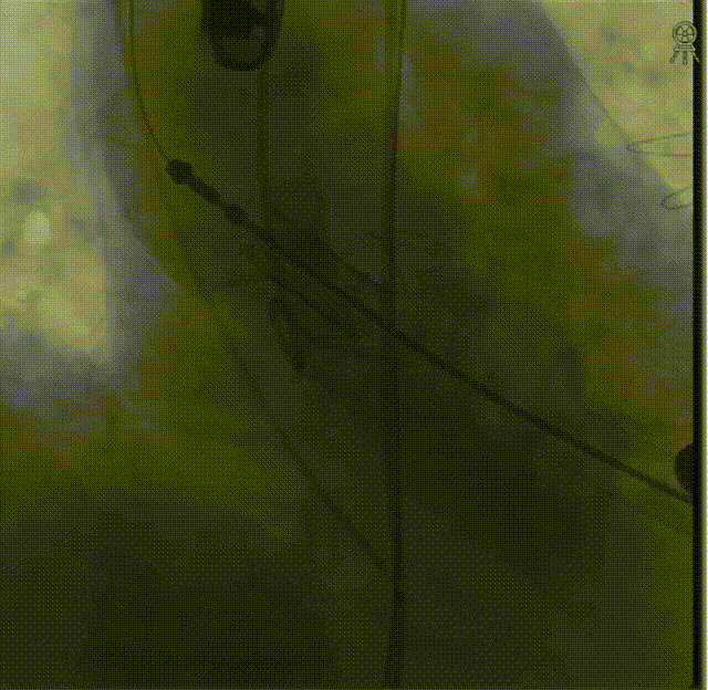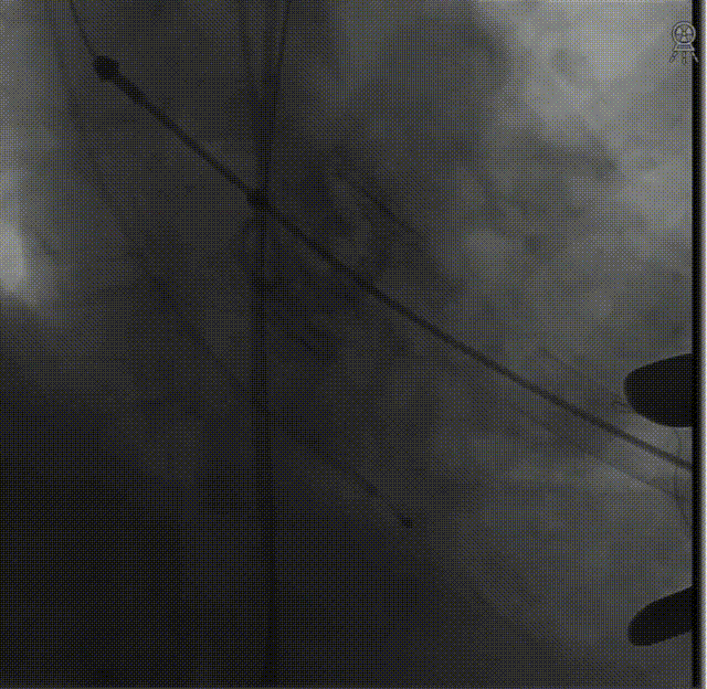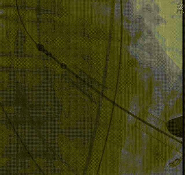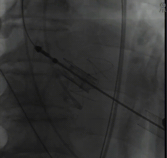 于右冠植入冠脉支架一枚,冠脉血流通畅: