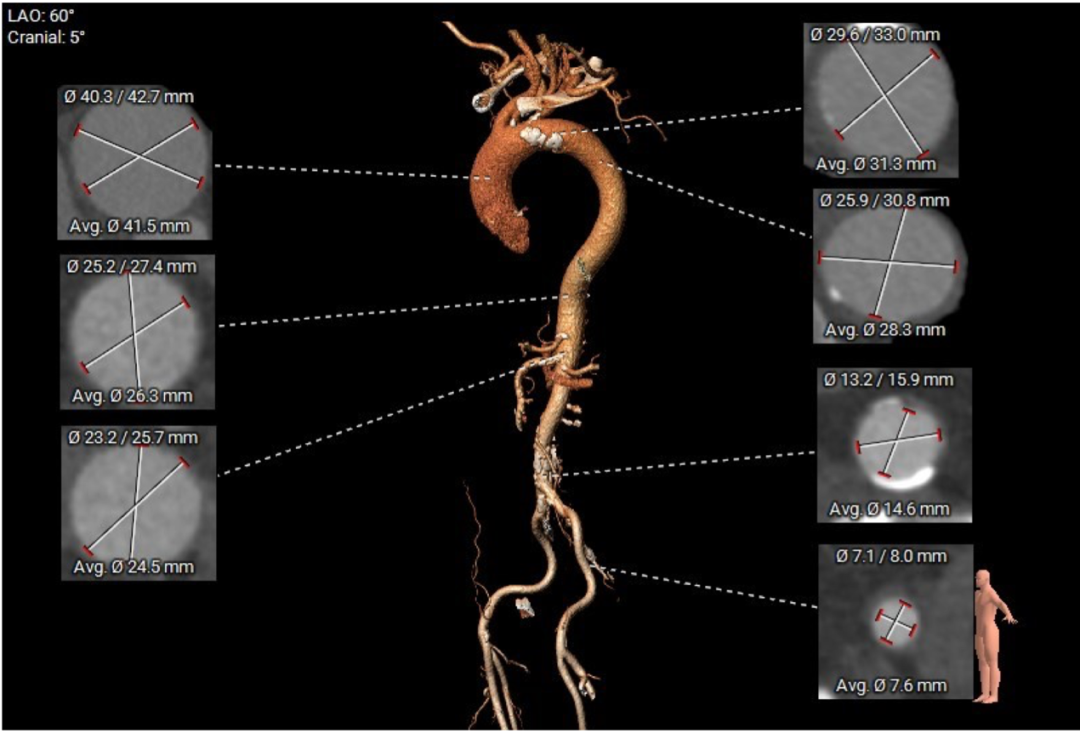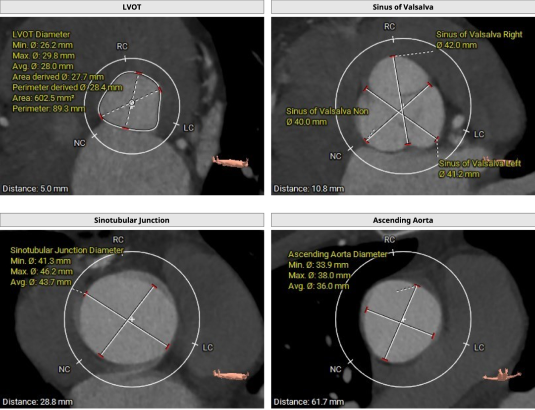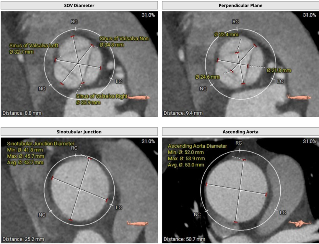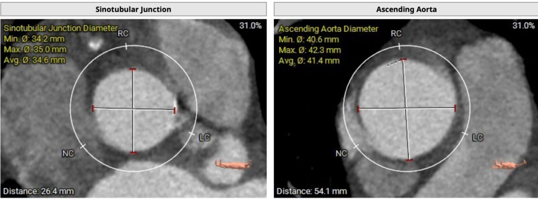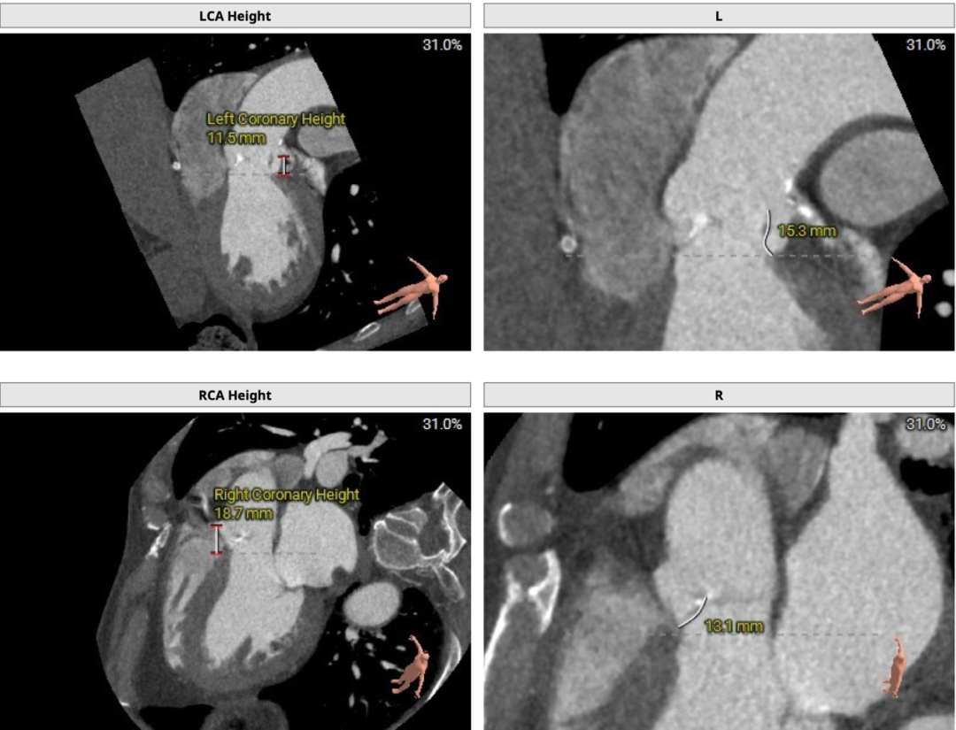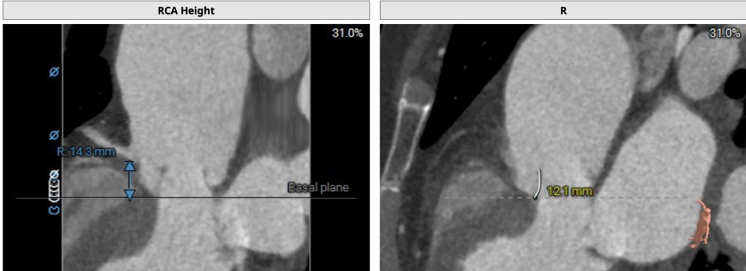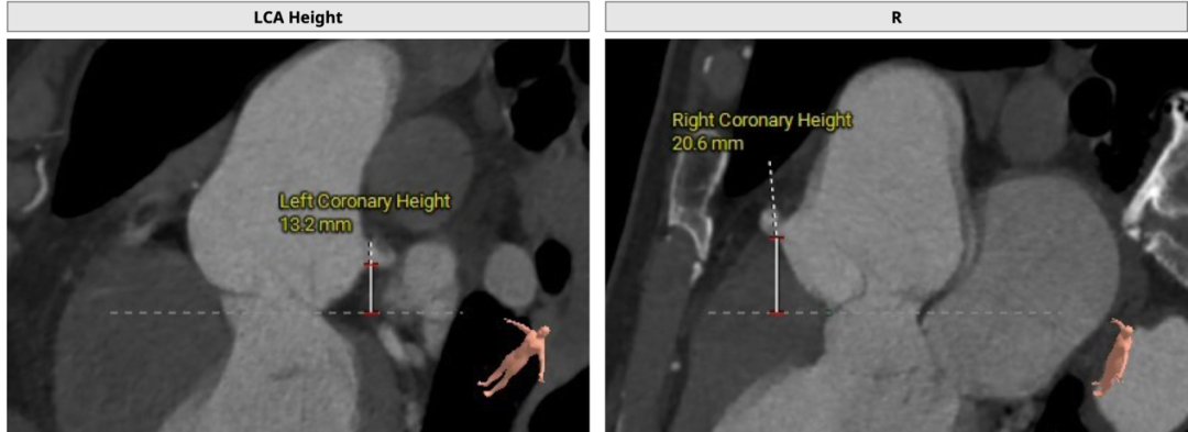 双侧冠脉开口高度可,LCA 13.2mm,RCA 20.6mm: