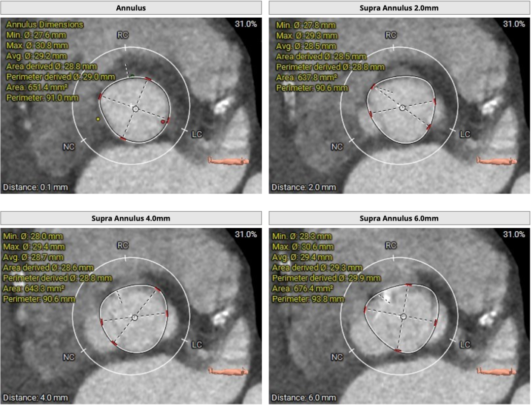 患者主动脉瓣三叶式,瓣叶基本等大,瓣叶稍厚,右无冠瓣瓣叶游离缘轻度钙化,瓣叶交界钙化有融合;主动脉瓣环周长折算直径约29.0mm: