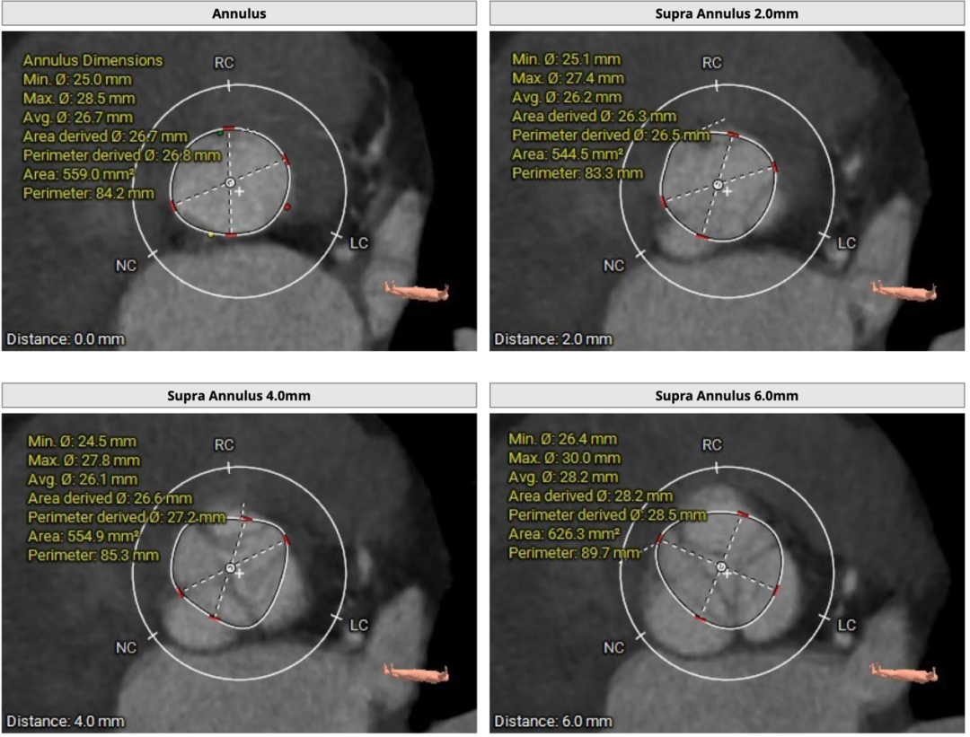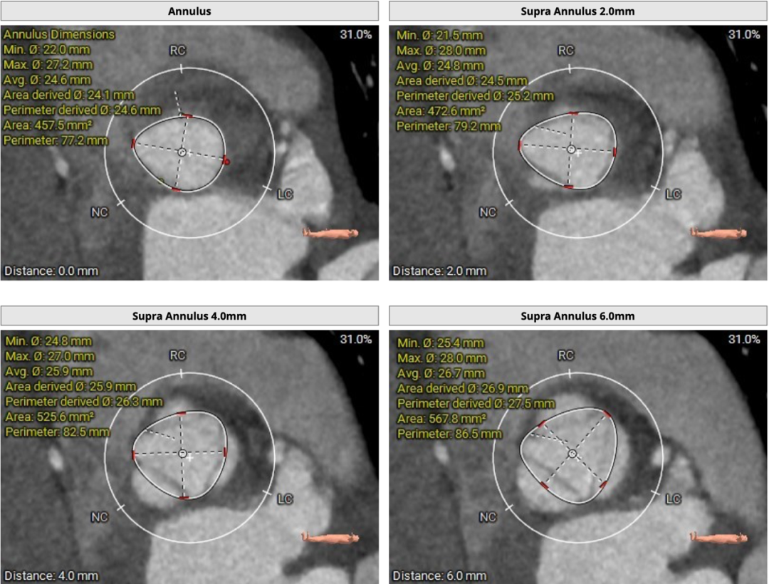 患者主动脉瓣三叶式,瓣叶基本等大,瓣叶不厚,瓣叶未见明显钙化。主动脉瓣环周长折算直径约24.6mm: