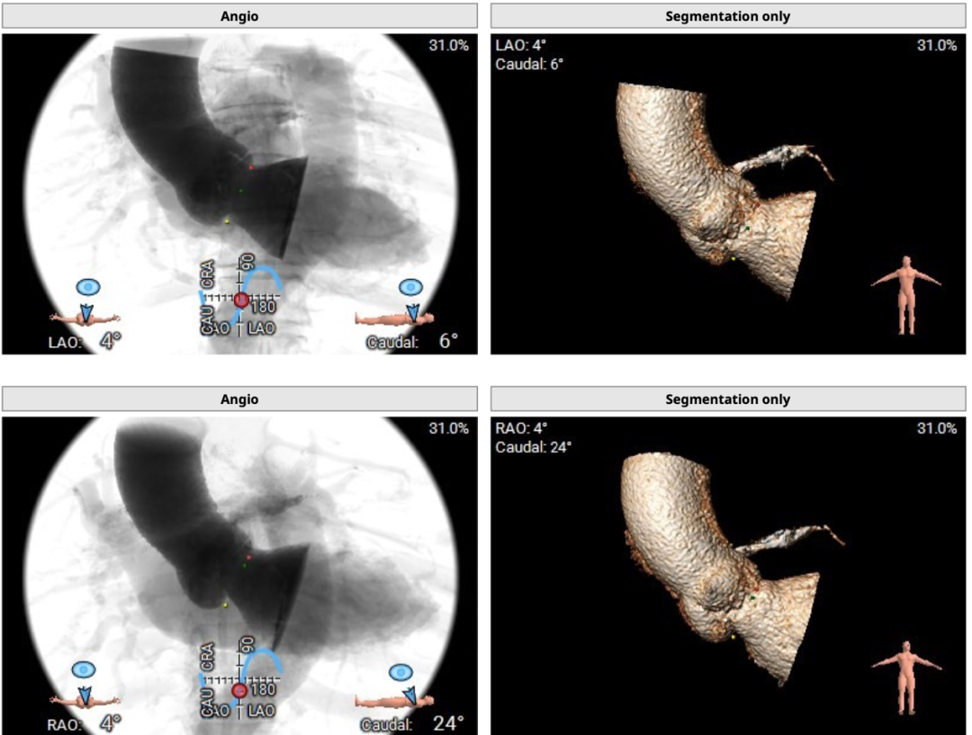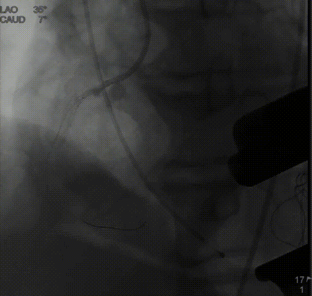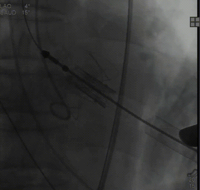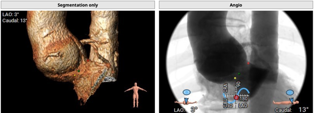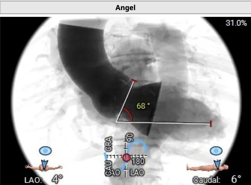 术中建议造影角度LAO 4°,CAU 6°(其它考角度如下图):