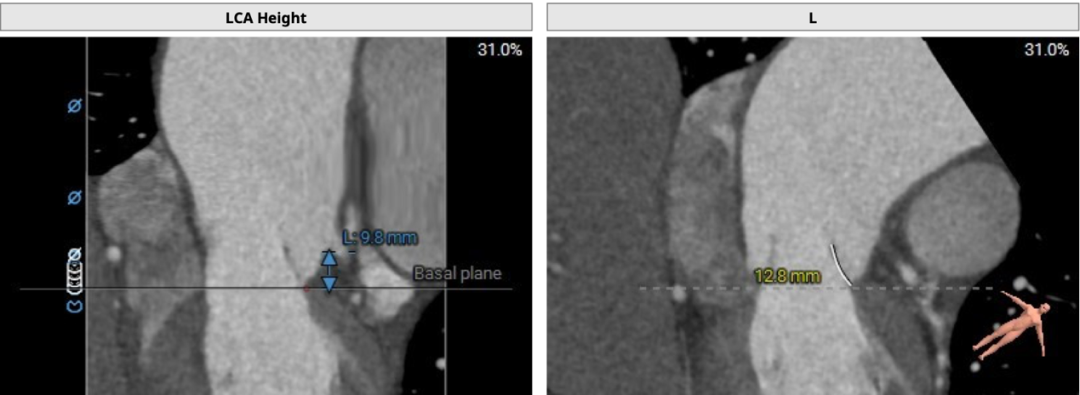 左侧冠脉开口高度低,LCA 9.8mm,左冠瓣瓣叶长度约12.8mm;右侧冠脉开口高度可,RCA 14.3mm: