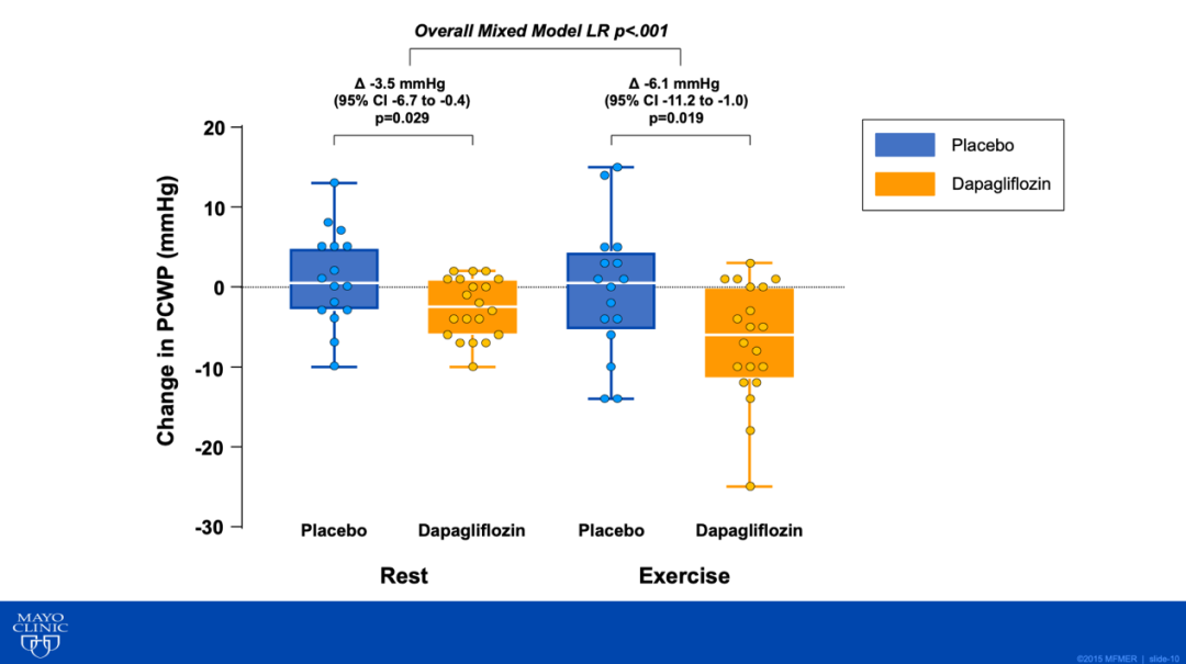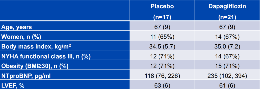 射血分数保留型心力衰竭(heart failure with preserved ejection fration, HFpEF)占所有心力衰竭的50%,但有效的治疗方法很少,多项药物临床试验均未能得出阳性结果,而许多能够改善射血分数降低型心衰患者生存的药物也未能在HFpEF患者中表现出优势;既往研究表明,钠葡萄糖协同转运蛋白2抑制剂SGLT-2i达格列净和恩格列净能够降低心衰住院率、心血管事件死亡率并提高HFpEF患者生活质量,但机制尚不清楚。另一方面,HFpEF患者的基本病理生理特征是休息时和运动时左心充盈压力升高。据此,梅奥诊所的Borlaug等提出研究假设:达格列净治疗24周可能有利于降低HFpEF患者静息和运动时的左心充盈压力,并设计开展了本项单中心、双盲、随机对照试验。