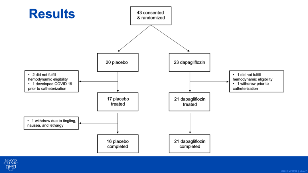 研究筛选了肺毛细血管楔压(PCWP)≥25mmHg,NYHA心功能2-3级的HFpEF患者,并排除了I型糖尿病、原发性心肌病、心包疾病、其他由非HFpEF引起的呼吸困难或心衰,最终纳入43名符合条件的受试者。随机分组后23例患者接受10mg达格列净治疗24周,20例患者接受安慰剂治疗。两组患者分别在基线和治疗24周时通过有创运动检查和血流动力学检测等方法评估达格列净的治疗效果。主要终点为静息状态和峰值运动量下肺毛细血管楔压(PCWP);次要终点包括静息/运动时右室(RA)和肺动脉压力(PA)、直接测得的血容量、红细胞体积、血浆容量以及体重。安慰剂组最终16人完成试验,达格列净组最终21人完成试验(图1)。