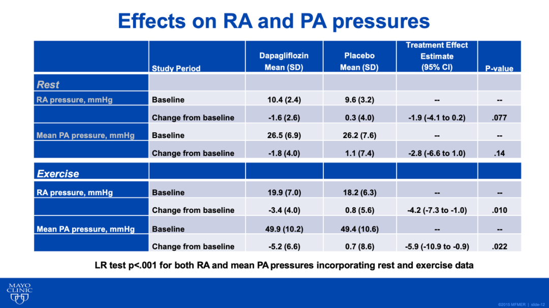 在对右心房(RA)和肺动脉(PA)压力的影响方面,静息状态下达格列净组治疗24周后RA和PA压力降低幅度与安慰剂组相比均无显著统计学差异,但运动状态下,达格列净组RA和PA压力变化幅度显著高于安慰剂组,两组患者RA与PA压力变化幅度之差分别为-4.2mmHg(p=0.10)和-5.9mmHg(p=0.022,图4)。