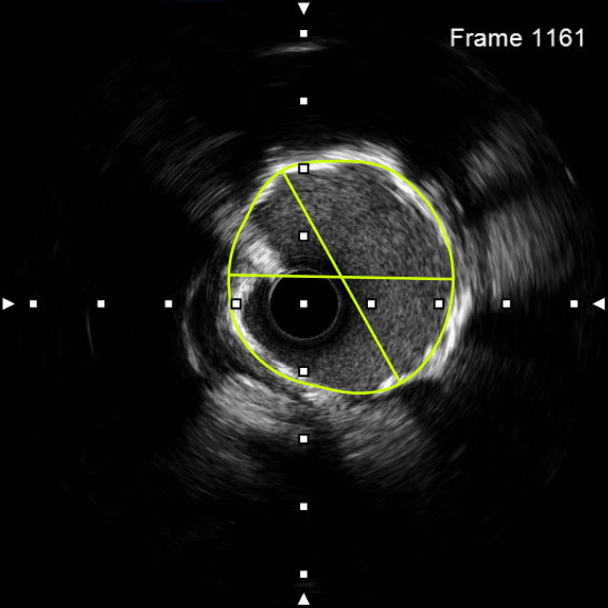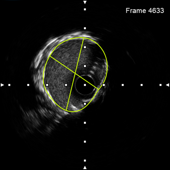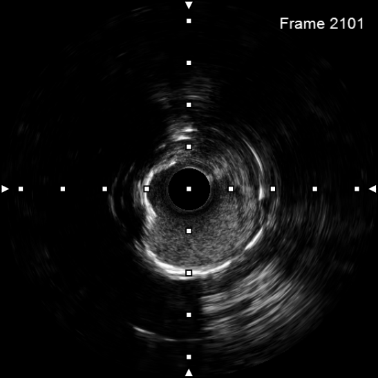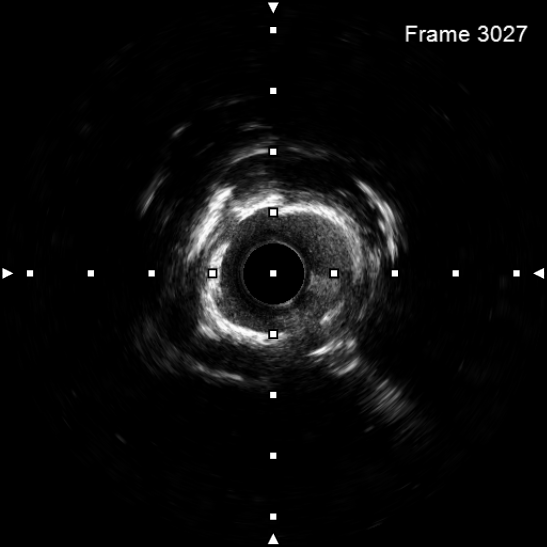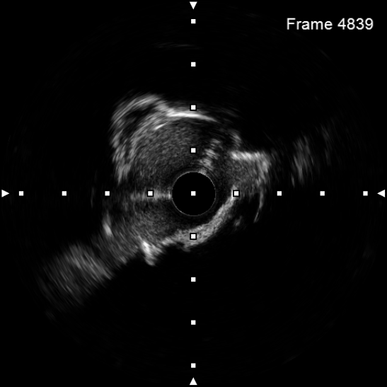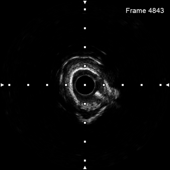 该患者入院后,完善相关检查并再次建议行CABG治疗,但家属仍拒绝,遂考虑再次行PCI手术干预。冠脉造影提示患者冠脉右冠状动脉中段70-95%再狭窄,左主干末端80%狭窄,前降支原支架中远段 80-95%再狭窄,回旋支完全闭塞,急需手术尽快解决冠脉血流灌注问题,否则随时有生命风险,但患者多处支架内/节段内再狭窄,造影提示钙化明显,外院已尝试无法扩张,经手术团队充分讨论后,计划在IABP支持下,先进行右冠状动脉干预,利用IVUS精准评估原支架再狭窄部位情况,采用旋磨或Shockwave冲击波球囊处理无法扩张的病变部位,右冠处理后择期进行左冠状动脉干预。在制定了详尽的手术计划后,手术团队首先对患者的右冠状动脉行IVUS检查,结果提示该患者右冠中段支架局部膨胀不良,局部支架面积6.67mm²,管腔内多处可见钙化小结及270°以上钙化,IVUS钙化积分达3分。由于膨胀不良处原支架后方可见钙化斑块,常规旋磨效果不佳,对于此类钙化病变,IVL处理是最佳方案。手术团队对近端采取棘突球囊及高压球囊进行扩张,采用Guidezilla辅助下输送3.0mmx12mm Shockwave冲击波球囊于右冠钙化处进行冲击波钙化斑块碎裂术,通过IVUS证实支架内的新生钙化病变得到松解,原膨胀不良部位支架面积达到7.76mm²,后经过高压球囊充分预处理,顺利完成右冠支架植入,术后复查右冠原膨胀不良部位支架面积9.17mm²。