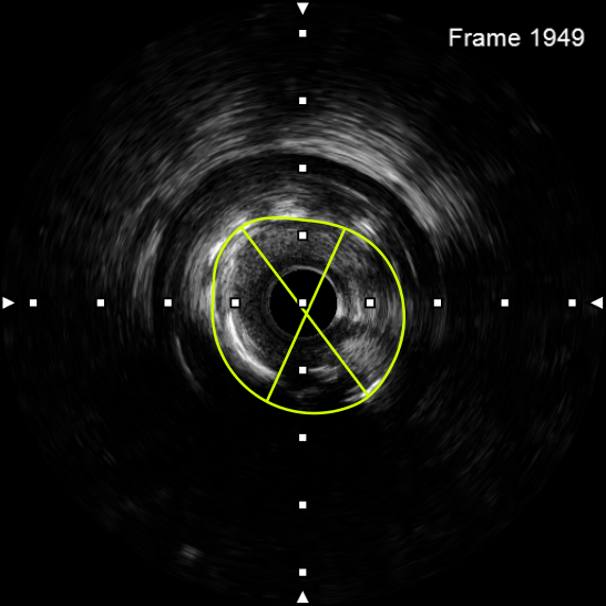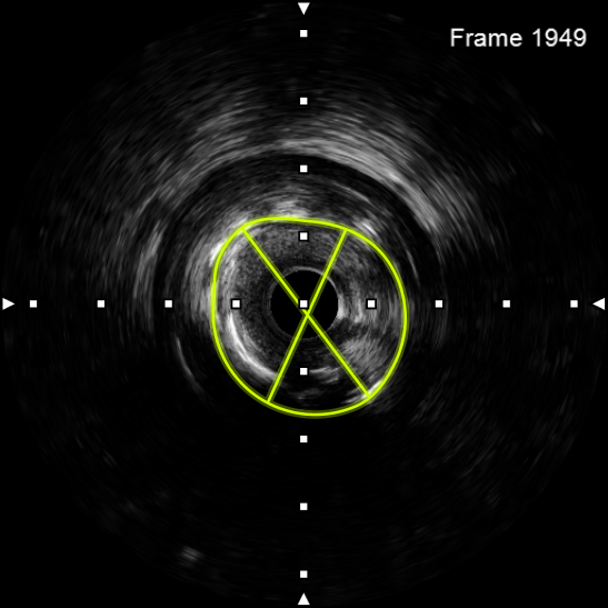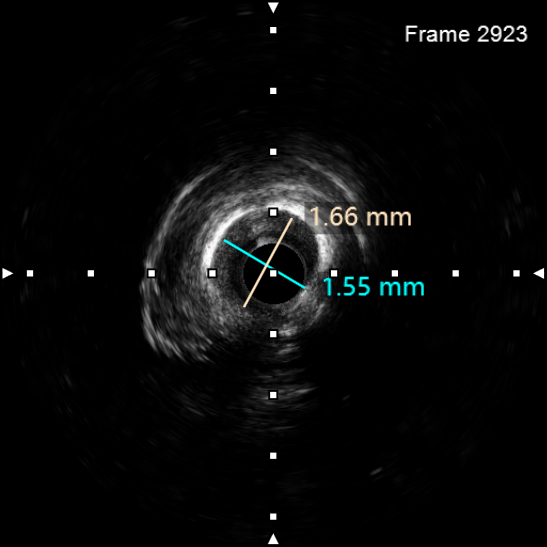 2天后再次干预患者左冠状动脉,首先开通回旋支并进行球囊扩张,采用IVUS进行前降支至左主干支架评估,IVUS提示左主干末端原支架内可见新生环状钙化病变,采用3.0x12mm Shockwave预处理后可见钙化断裂,并再次经高压球囊预处理,于前降支至左主干植入支架,术后造影及IVUS均提示支架膨胀良好,左主干MSA 9.96mm²。患者经介入干预后,胸痛症状较前明显缓解,体力活动较前恢复。