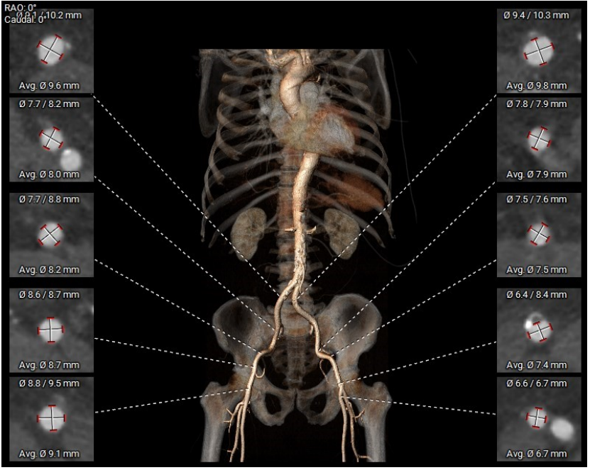 双侧股动脉入路内径可,走行良好,主动脉弓部及腹主动脉可见钙化。