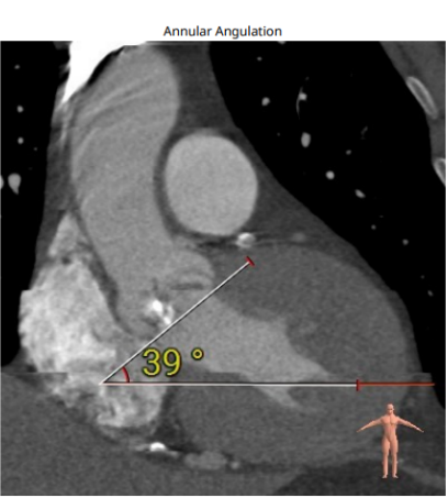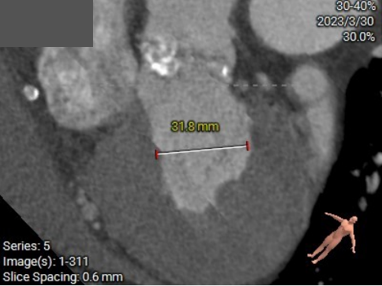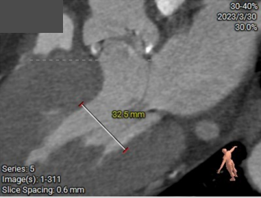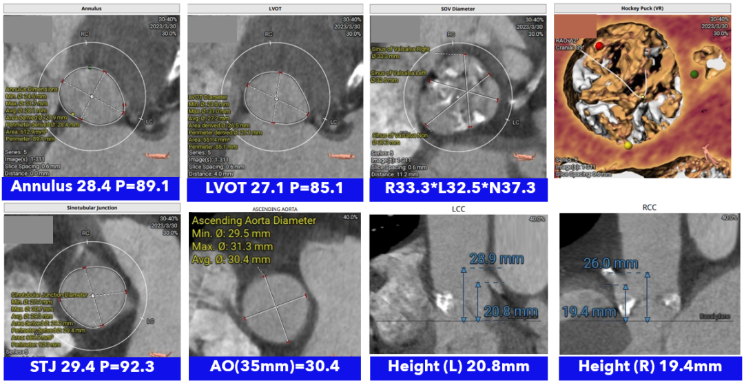 三叶瓣,瓣环偏大,右无瓣叶钙化重;LVOT直径小于瓣环直径,呈漏斗形;窦部直径可,STJ及升主直径偏小,双冠脉高度可;主动脉根部角度约39°;室间隔及室壁增厚,LV偏小。