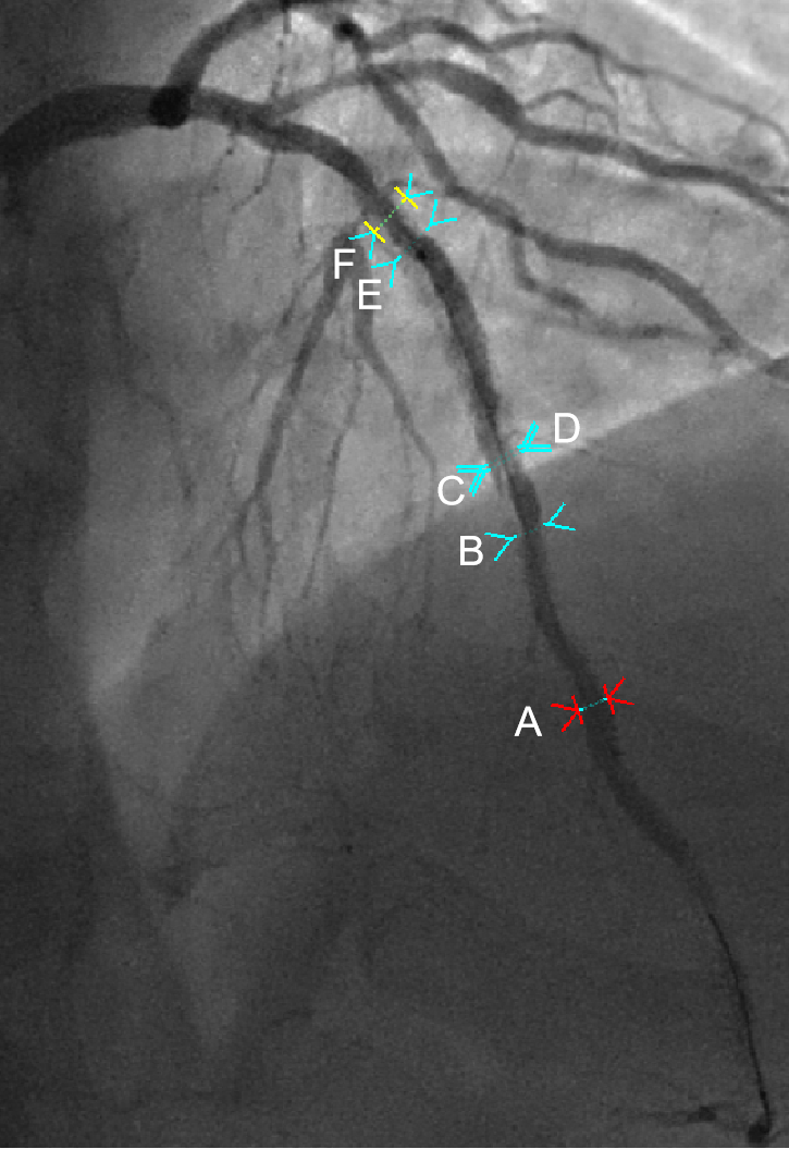 此次心梗在图中E-F段,刚好是三层支架部位,有支架贴壁不良的情况,且有可能的斑块破溃存在。
