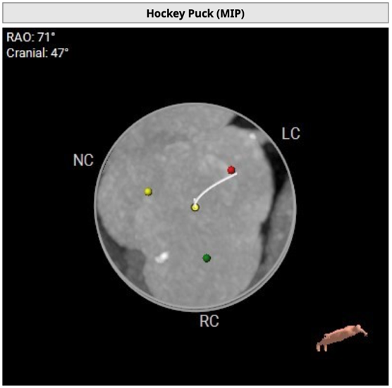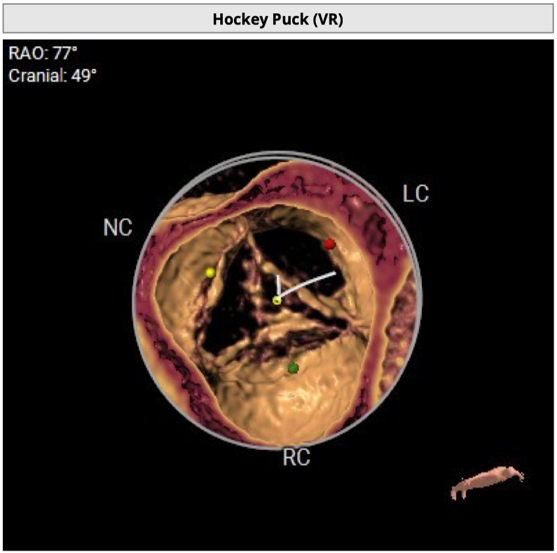 患者深度镇静后超声引导下建立入路,跨瓣后左室放置预塑形导丝,使用TaurusTrio系统定制的等效于18F超长导引鞘定位STJ。输送系统装载THV27瓣膜,在大鞘保护下从右股动脉送入,安全通过降主动脉及钙化弓顶。在右窦中心位下,回撤导引鞘远端至降主动脉后定位键展开,使用调弯功能改善瓣膜同轴性,DSA下观察THV从大弯侧调至居中,再通过旋转定位手柄在右窦中心位下调整三个定位键与原生窦一一对齐,后推进THV使定位键进入窦底,实现Commissural alignment,通过造影依次确认无、右、左窦内定位键及深度后,最终脱钩释放。术后即刻超声心动图评估显示瓣膜位置良好,无瓣周漏,无中心反流,血流动力学指标优异。