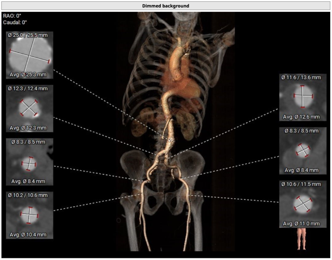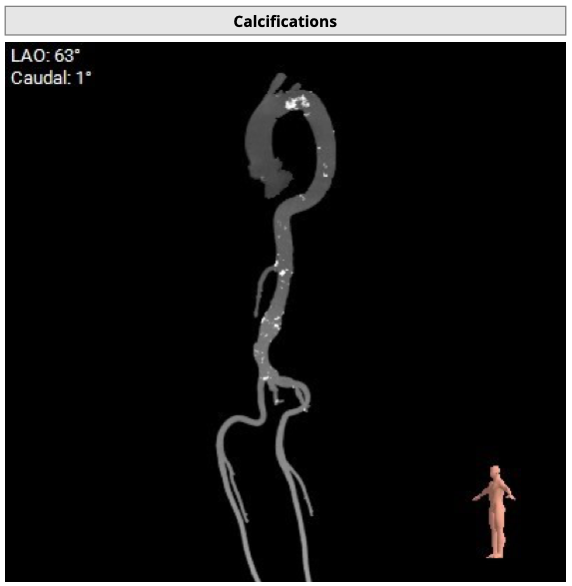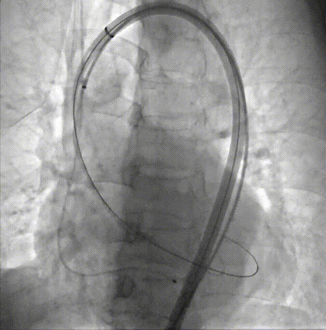 整体入路血管条件尚可,血管内径可,患者有明显的脊柱侧弯,并伴有腹主动脉瘤,降主动脉稍有扭曲,腹主动脉、降主动脉及弓顶有少许钙化斑块。