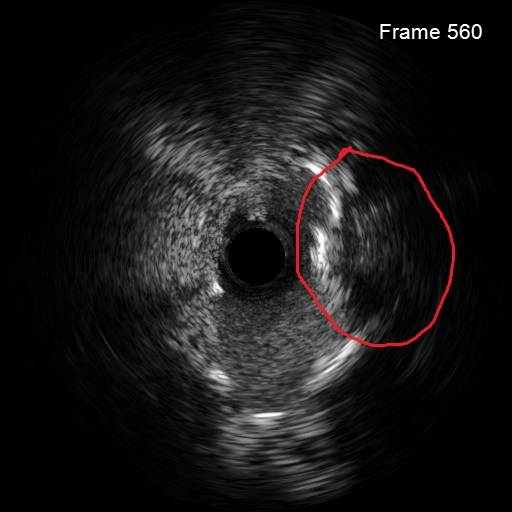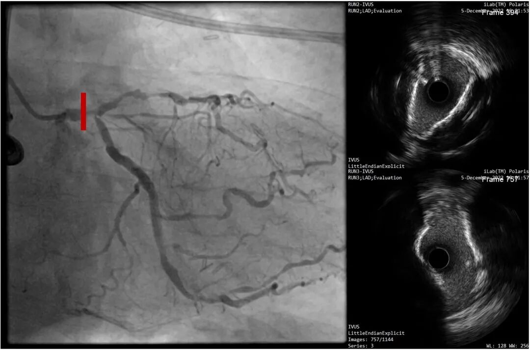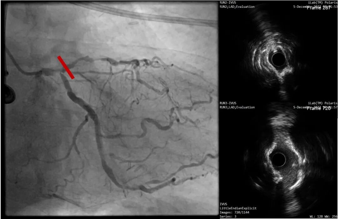复查LAD近段-LM IVUS,钙化环明显断裂