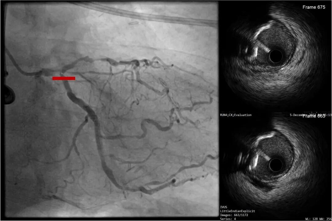 考虑到患者钙化严重且弥漫,为精准化钙化病变预处理方案,对患者进行IVUS检查,但超声导管无法通过病变部位;