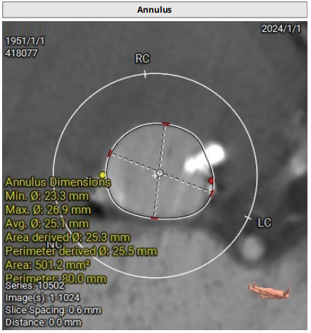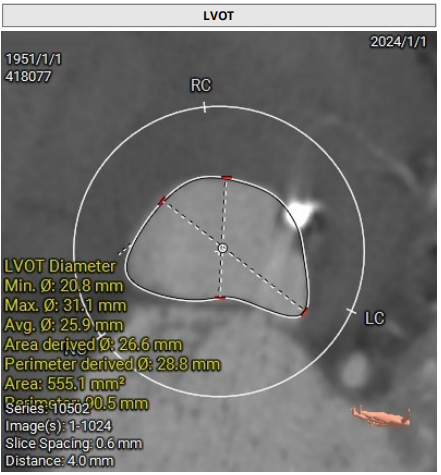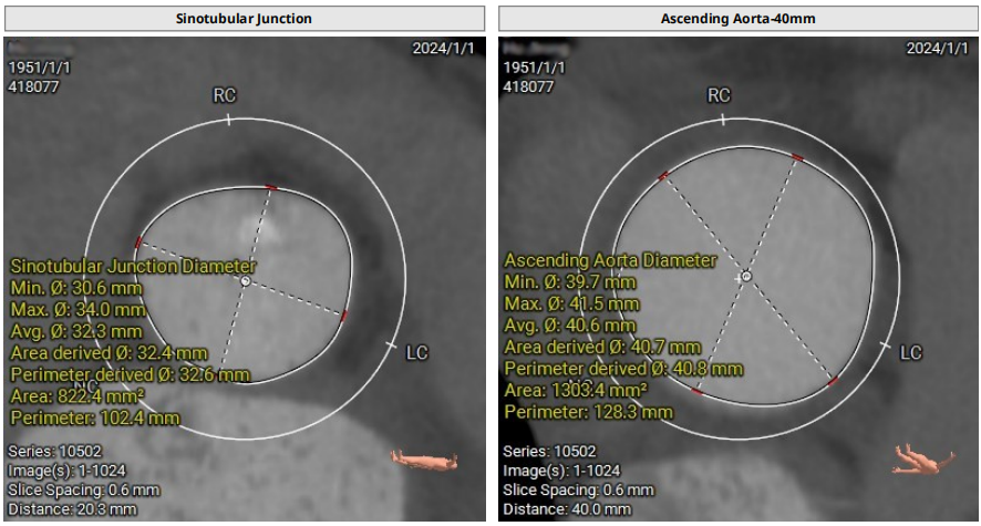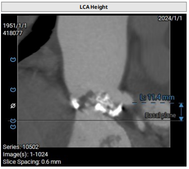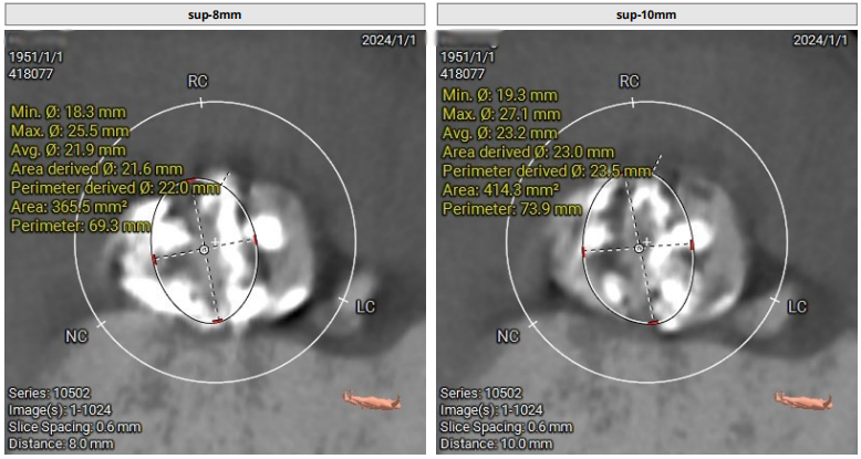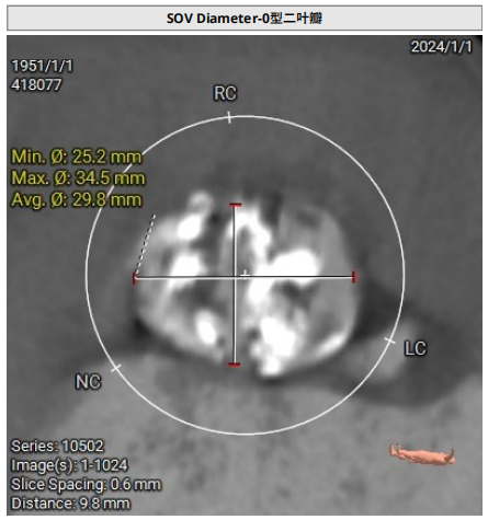 主动脉根部:Type0型二叶瓣,瓣叶钙化重,瓣环钙化,无右冠,左冠脉高度可,左冠脉开口水平可见瓣叶,左室扩张,双下肢内径可。