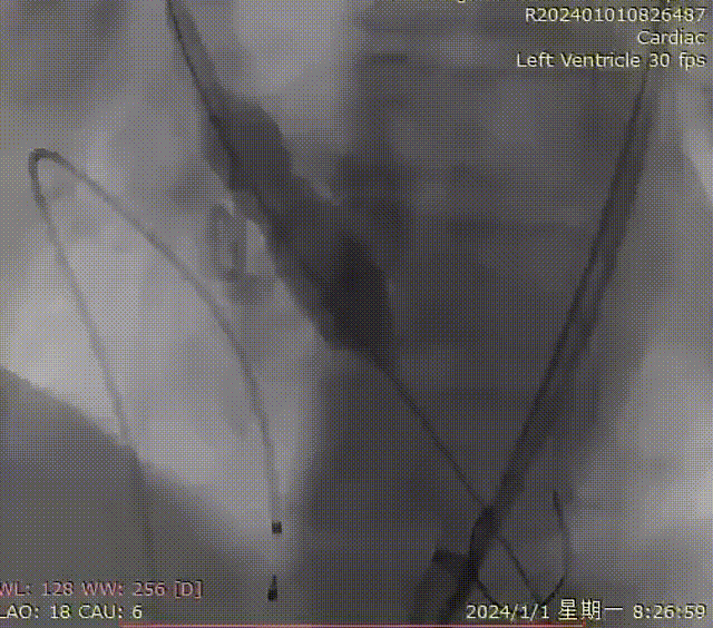 经右侧股动脉全麻下行TAVR,180 bpm起搏下预扩主动脉瓣,18 mm球囊扩张后快速负压回抽球囊,停止起搏。造影可见造影剂返流至左室,主动脉瓣扩张满意,无瓣环及冠脉损伤。撤出球囊,经超硬导丝送入L26VenusA-Plus瓣膜,造影下调整位置满意后释放瓣膜。多体位造影示瓣膜支架开放欠佳,冠脉通畅。撤出瓣膜输送系统,再次送入20mm球囊,起搏器配合下行后扩张,扩张后造影示,主动脉瓣无瓣周漏,无瓣环、冠脉及损伤,冠脉通畅。