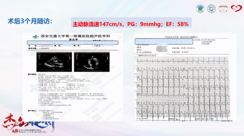 术后3个月随访心脏彩超示:主动脉流速147cm/s,PG:9mmhg,EF 58%。